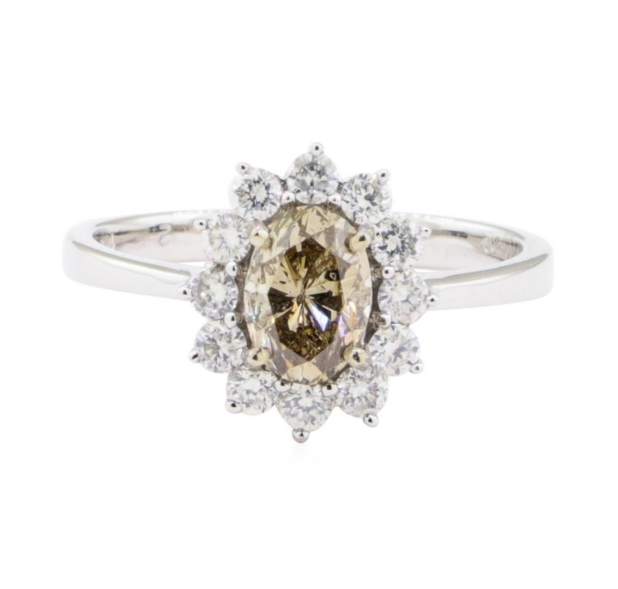 One electronically tested 14KT white gold ladies cast diamond ring with a bright polish finish. The featured diamond is set within a diamond floret supported by diamond set shoulders, completed by a two millimeter wide band. Trademark is Orianne. Identified with markings of "14K". Condition is new, good workmanship. Containing: One prong set oval shaped cut diamond, measuring 7.00 x 5.00 x 3.60mm (depth est.) approximate weight of 0.91ct. Graded in the setting. Clarity I-1 Depth 72.0% Table 62.0% Twelve prong set round brilliant cut diamonds, measuring 2.10 - 2.00 x 1.23mm (depth est.) approximate total weight of 12 Stones = 0.44ct. Graded in the setting. Clarity I-1 to I-2 Color G - I Total Weight of Diamonds 1.35 ct. Estimated Retail Value $ 7,435.00 US