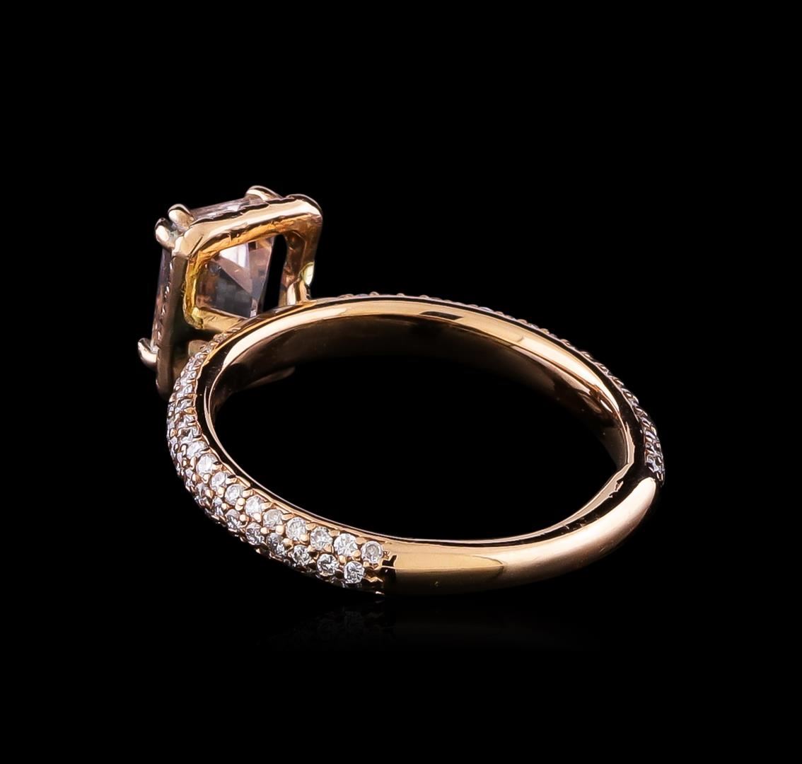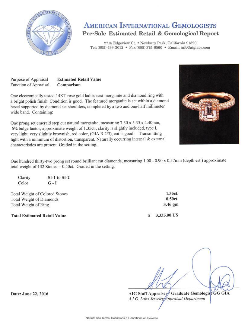 One electronically tested 14KT rose gold ladies cast morganite and diamond ring with a bright polish finish. The featured morganite is set within a diamond bezel supported by diamond set shoulders, completed by a two and one-half millimeter wide band. Condition is good. Containing: One prong set emerald step cut natural morganite, measuring 7.30 x 5.35 x 4.40mm, 6%. bulge factor, approximate weight of 1.35ct., clarity is slightly included, type I, very light, very slightly brownish, red color, (GIA R 2/3), cut is good. Transmitting light with a minimum of distortion, transparent. Naturally occurring internal & external characteristics are present. Graded in the setting. One Hundred Thirty-Two prong set round brilliant cut diamonds, measuring 1.00. - 0.90 x 0.57mm (depth est.) approximate total weight of 132 Stones = 0.50ct. Graded in the setting. Clarity: SI-1 to SI-2 . Color: G - I. Total Weight of Colored Stones 1.35ct.. Total Weight of Diamonds 0.50ct.. Total Weight of Ring 3.46gm. AIG Appraised at $3,335.00.