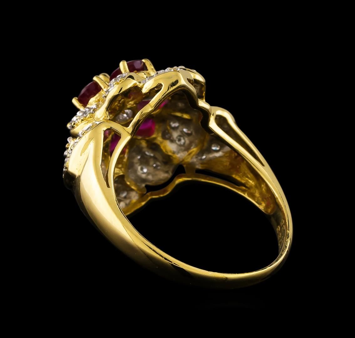 One electronically tested 18KT yellow gold ladies cast ruby and diamond cluster ring. The ring features a ruby flower with a diamond center set within a floret of diamond clusters, supported by diamond set tapering shoulders, completed by a two millimeter wide band. Bright and patterned finish with rhodium accents. Identified with markings of 'K18'. Condition is good. Containing: Six prong set oval mixed cut natural rubies, measuring 4.00 x 3.00 x 1.95mm, approximate total weight of 1.35ct., clarity is slightly included, type II, medium dark, very slightly brownish, slightly purplish red color, (GIA slpR 6/3), cut is good. Transmitting light with a minimum of distortion, transparent. Naturally occurring internal & external characteristics are present. Measurements & the color grade are an average for the group. Graded in the setting. One prong set round brilliant cut diamond, measuring 3.20 - 3.20 x 1.95mm (depth est.) approximate weight of 0.12ct. Graded in the setting. Clarity SI-2. Color: I Fifty-Four prong set round brilliant cut diamonds, measuring 1.30 - 1.10 x 0.72mm (depth est.) approximate total weight of 54 Stones = 0.41ct. The clarity grade reflects the entire range of clarity for this group. Graded in the setting. Clarity SI-1 to I-2. Color: G - I. Total Weight of Colored Stones 1.35ct.. Total Weight of Diamonds 0.53ct.. Total Weight of Ring 6.57gm. AIG Appraised at $3,610.00.