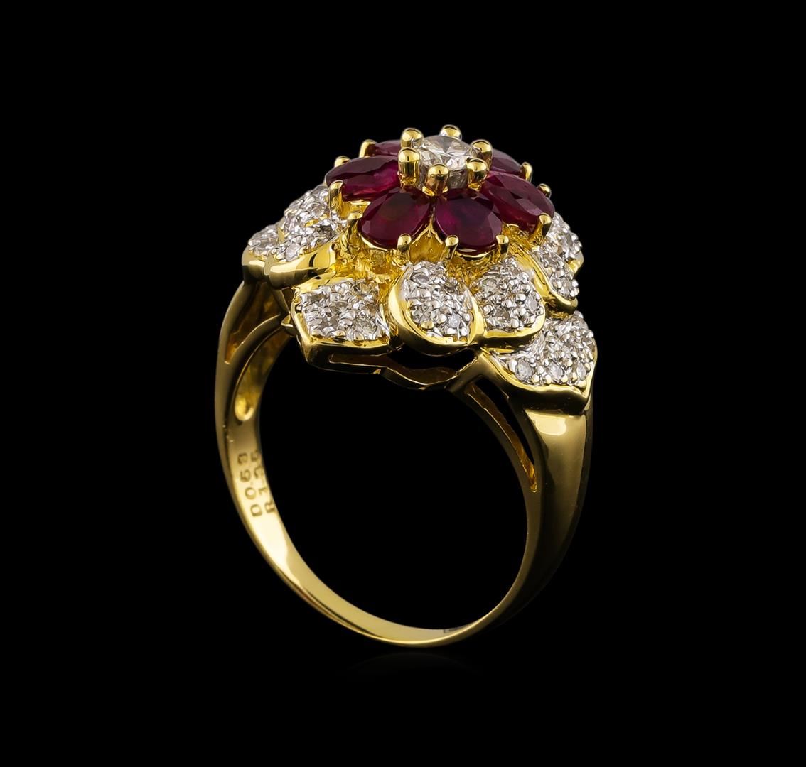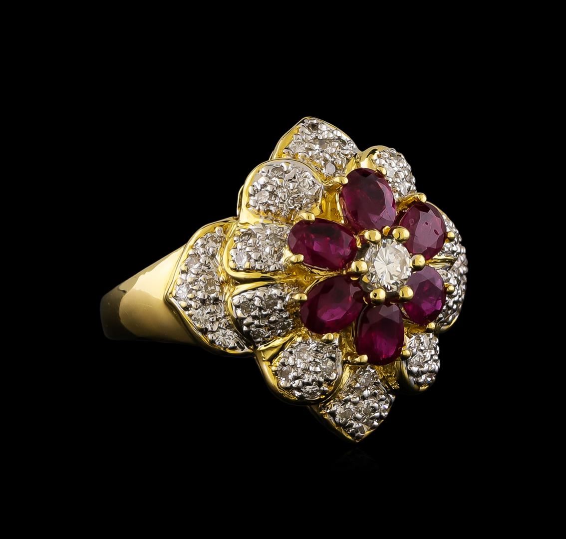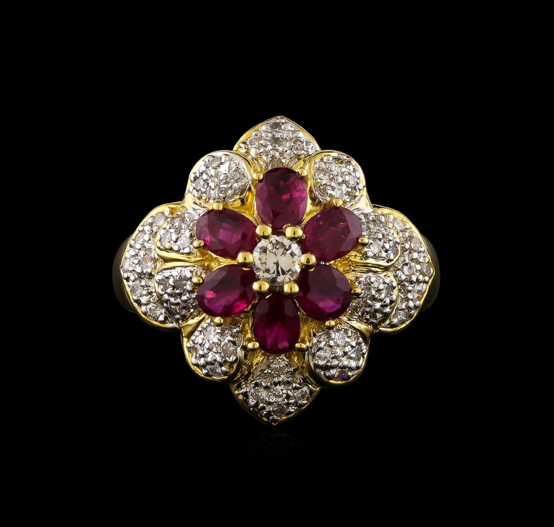 One electronically tested 18KT yellow gold ladies cast ruby and diamond cluster ring. The ring features a ruby flower with a diamond center set within a floret of diamond clusters, supported by diamond set tapering shoulders, completed by a two millimeter wide band. Bright and patterned finish with rhodium accents. Identified with markings of 'K18'. Condition is good. Containing: Six prong set oval mixed cut natural rubies, measuring 4.00 x 3.00 x 1.95mm, approximate total weight of 1.35ct., clarity is slightly included, type II, medium dark, very slightly brownish, slightly purplish red color, (GIA slpR 6/3), cut is good. Transmitting light with a minimum of distortion, transparent. Naturally occurring internal & external characteristics are present. Measurements & the color grade are an average for the group. Graded in the setting. One prong set round brilliant cut diamond, measuring 3.20 - 3.20 x 1.95mm (depth est.) approximate weight of 0.12ct. Graded in the setting. Clarity SI-2. Color: I Fifty-Four prong set round brilliant cut diamonds, measuring 1.30 - 1.10 x 0.72mm (depth est.) approximate total weight of 54 Stones = 0.41ct. The clarity grade reflects the entire range of clarity for this group. Graded in the setting. Clarity SI-1 to I-2. Color: G - I. Total Weight of Colored Stones 1.35ct.. Total Weight of Diamonds 0.53ct.. Total Weight of Ring 6.57gm. AIG Appraised at $3,610.00.