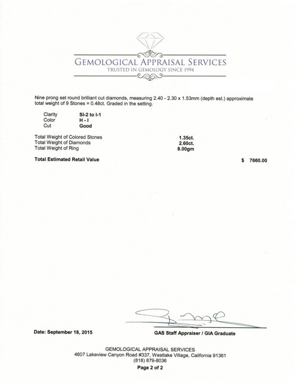 One electronically tested 14KT rose and white gold lady's combination cast & assembled fashion ring with a basket halo with a bright polish finish. The featured ladies ring has a shank that measures 2.95 millimeters in width. Identified with markings of "585". Condition is new, good workmanship. Containing: Eleven prong set round brilliant cut natural blue sapphires, measuring 2.90 - 2.80 x 1.86 mm, approximate total weight of 1.35ct., clarity is slightly included, type II, medium dark, moderately strong, blue color, (GIA B 6/4), cut is very good. Colored gemstones are presumed to have been subjected to commonly used enhancement processes. Indications of laboratory high temperature heat treatment. Graded in the setting. One prong set round brilliant cut diamond, measuring 3.90 - 3.80 x 2.39mm (depth est.) approximate weight of 0.21ct. Graded in the setting. Clarity: I-1. Color: Good Twenty-Four prong set round brilliant cut diamonds, measuring 2.50 - 2.40 x 1.59mm (depth est.) approximate total weight of 24 Stones = 1.43ct. Graded in the setting. Clarity: SI-2 to I-1. Color: I - Good Twenty-Seven prong set round brilliant cut diamonds, measuring 1.70 - 1.60 x 1.07mm (depth est.) approximate total weight of 27 Stones = 0.48ct. Graded in the setting. Clarity: SI-2 to I-1. Color: H - I. Cut Good Nine prong set round brilliant cut diamonds, measuring 2.40 - 2.30 x 1.53mm (depth est.) approximate total weight of 9 Stones = 0.48ct. Graded in the setting. Clarity: SI-2 to I-1. Color: H - I. Cut Good. Total Weight of Colored Stones 1.35ct. Total Weight of Diamonds 2.60 ct. Total Weight of Ring 8.00gm. GAS Appraised.