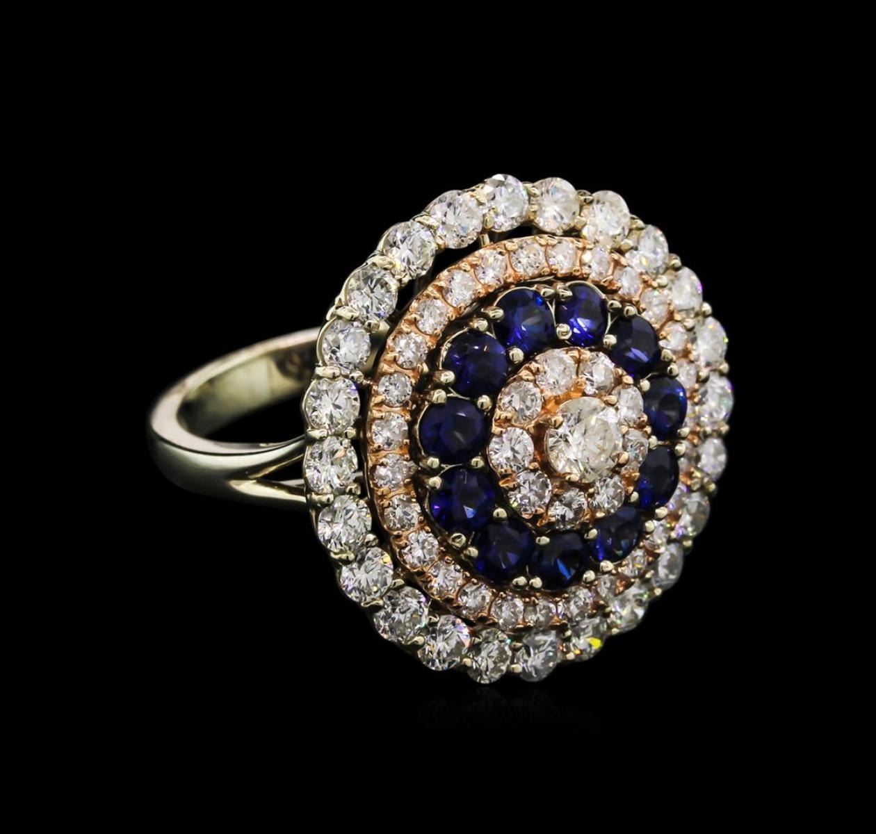 One electronically tested 14KT rose and white gold lady's combination cast & assembled fashion ring with a basket halo with a bright polish finish. The featured ladies ring has a shank that measures 2.95 millimeters in width. Identified with markings of "585". Condition is new, good workmanship. Containing: Eleven prong set round brilliant cut natural blue sapphires, measuring 2.90 - 2.80 x 1.86 mm, approximate total weight of 1.35ct., clarity is slightly included, type II, medium dark, moderately strong, blue color, (GIA B 6/4), cut is very good. Colored gemstones are presumed to have been subjected to commonly used enhancement processes. Indications of laboratory high temperature heat treatment. Graded in the setting. One prong set round brilliant cut diamond, measuring 3.90 - 3.80 x 2.39mm (depth est.) approximate weight of 0.21ct. Graded in the setting. Clarity: I-1. Color: Good Twenty-Four prong set round brilliant cut diamonds, measuring 2.50 - 2.40 x 1.59mm (depth est.) approximate total weight of 24 Stones = 1.43ct. Graded in the setting. Clarity: SI-2 to I-1. Color: I - Good Twenty-Seven prong set round brilliant cut diamonds, measuring 1.70 - 1.60 x 1.07mm (depth est.) approximate total weight of 27 Stones = 0.48ct. Graded in the setting. Clarity: SI-2 to I-1. Color: H - I. Cut Good Nine prong set round brilliant cut diamonds, measuring 2.40 - 2.30 x 1.53mm (depth est.) approximate total weight of 9 Stones = 0.48ct. Graded in the setting. Clarity: SI-2 to I-1. Color: H - I. Cut Good. Total Weight of Colored Stones 1.35ct. Total Weight of Diamonds 2.60 ct. Total Weight of Ring 8.00gm. GAS Appraised.