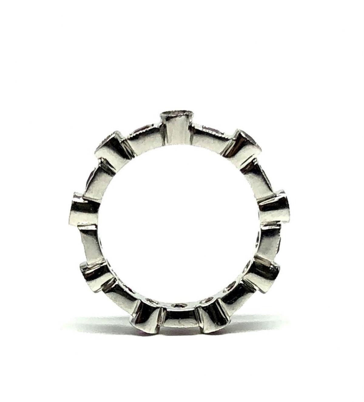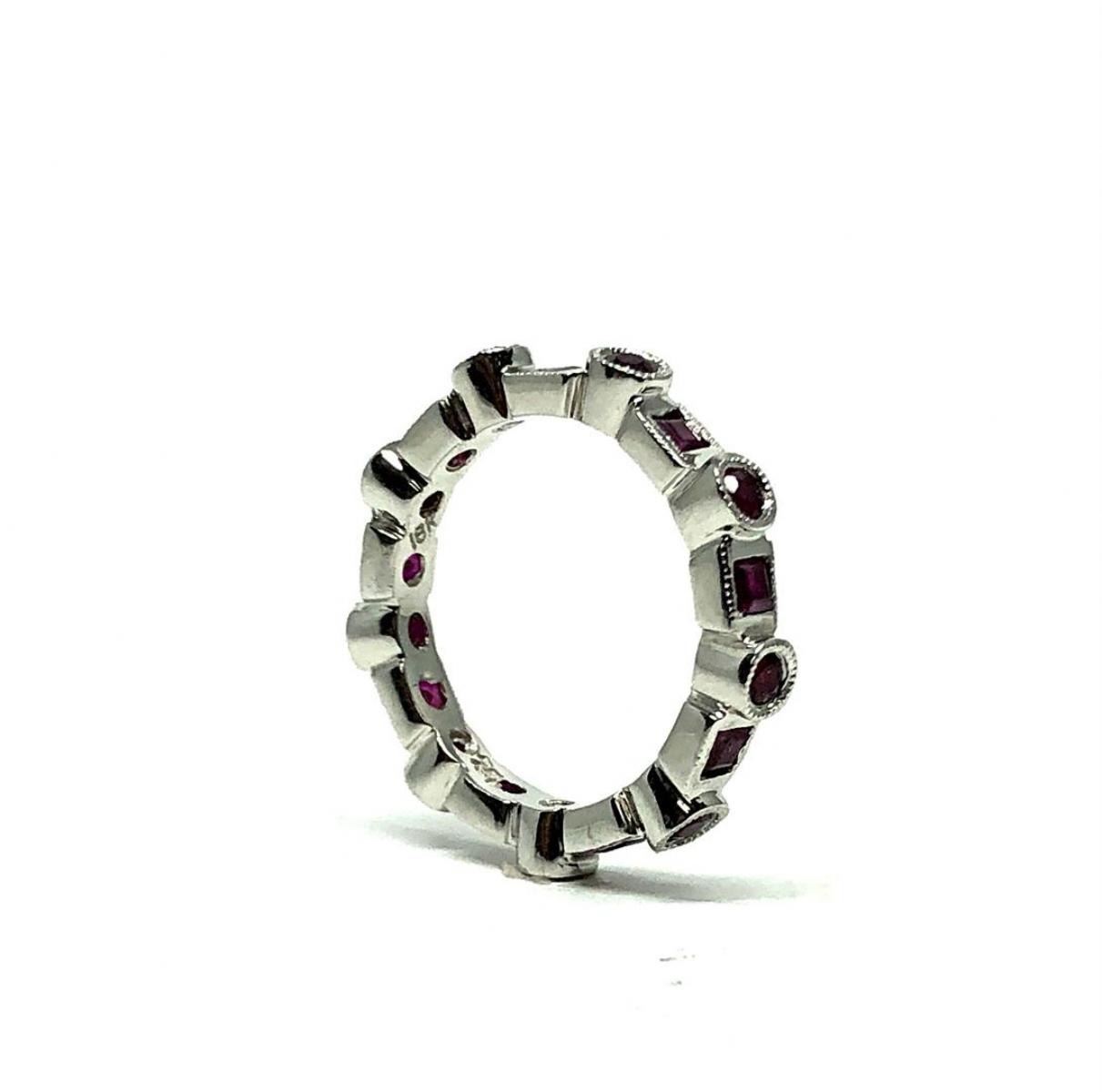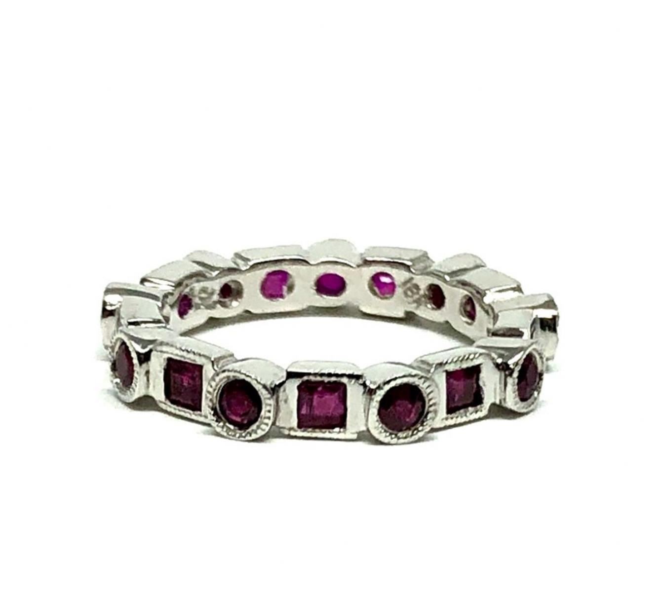 One electronically tested 18KT white gold lady's cast fashion eternity ring with a round and square motif with a bright polish with milgrain detailing finish. The featured lady's ring has a shank measuring 3.00 millimeters in width. Identified with markings of '750'. Condition is new, good workmanship. Containing: Nine bezel set round brilliant cut natural rubies, measuring 2.20 - 2.15 x 1.70 mm, (depth est.) approximate total weight of 0.65ct., clarity is slightly included, medium, moderately strong, red color, (GIA R 5/4), cut is very good. Transmitting light with a minimum of distortion, transparent. Colored gemstones are presumed to have been subjected to commonly used enhancement processes. Graded in the setting. Nine bezel set square standard step cut natural rubies, measuring 2.25 x 2.25 x 1.60mm, (depth est.) approximate total weight of 0.70ct., clarity is moderately included, medium dark, moderately strong, red color, (GIA R 6/4), cut is good. Transmitting light somewhat diffusely, transparent to translucent. Colored gemstones are presumed to have been subjected to commonly used enhancement processes. Graded in the setting. Total Weight of Colored Stones 1.35ct.. Total Weight of Ring 3.40gm GAS Appraised at  $1875.00.
