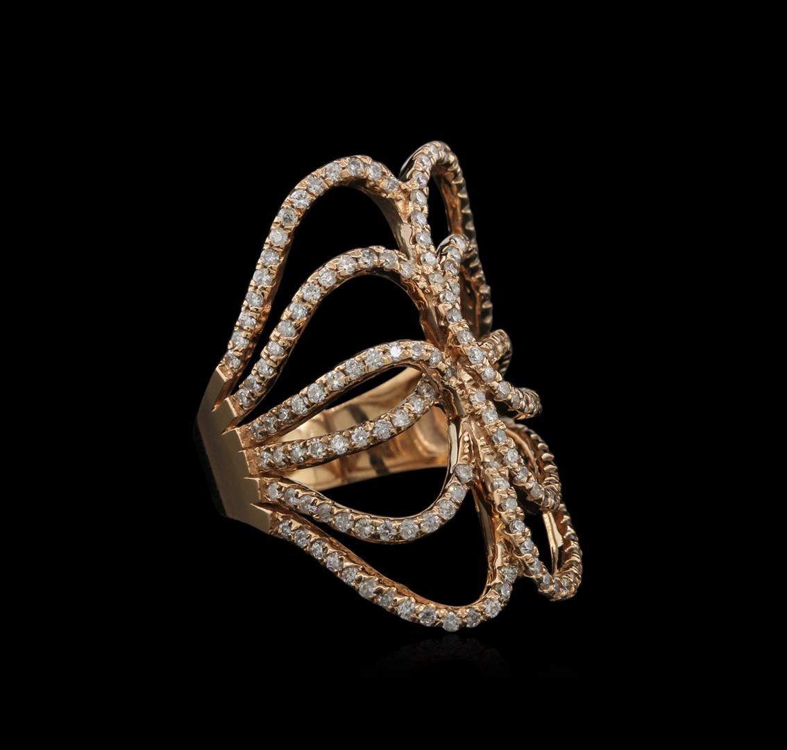 One electronically tested 14KT rose gold ladies cast diamond ring with a bright polish finish. The ring features multiple intertwining diamond ribbons, completed by a four and one-half millimeter wide band. Identified with markings of "K14". Condition is new, good workmanship. Containing: One Hundred Eighty prong set round brilliant cut diamonds approximate total weight of 180 Stones = 1.35ct. Graded in the setting. Clarity I-1 to I-2 Color G - I. Total Weight of Diamonds 1.35ct. Total Weight of Ring 8.39 grams. AIG Appraised at $5,060.00.
