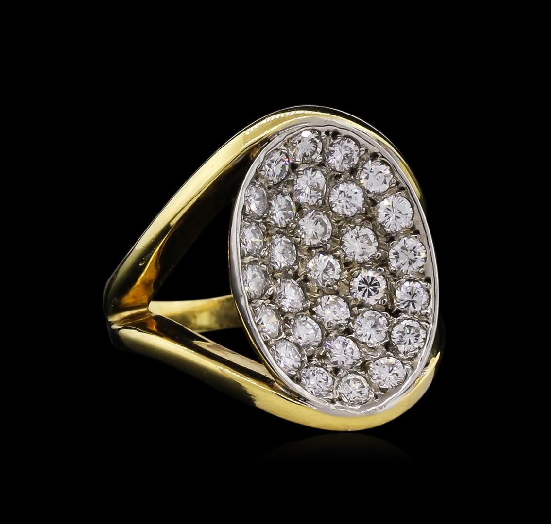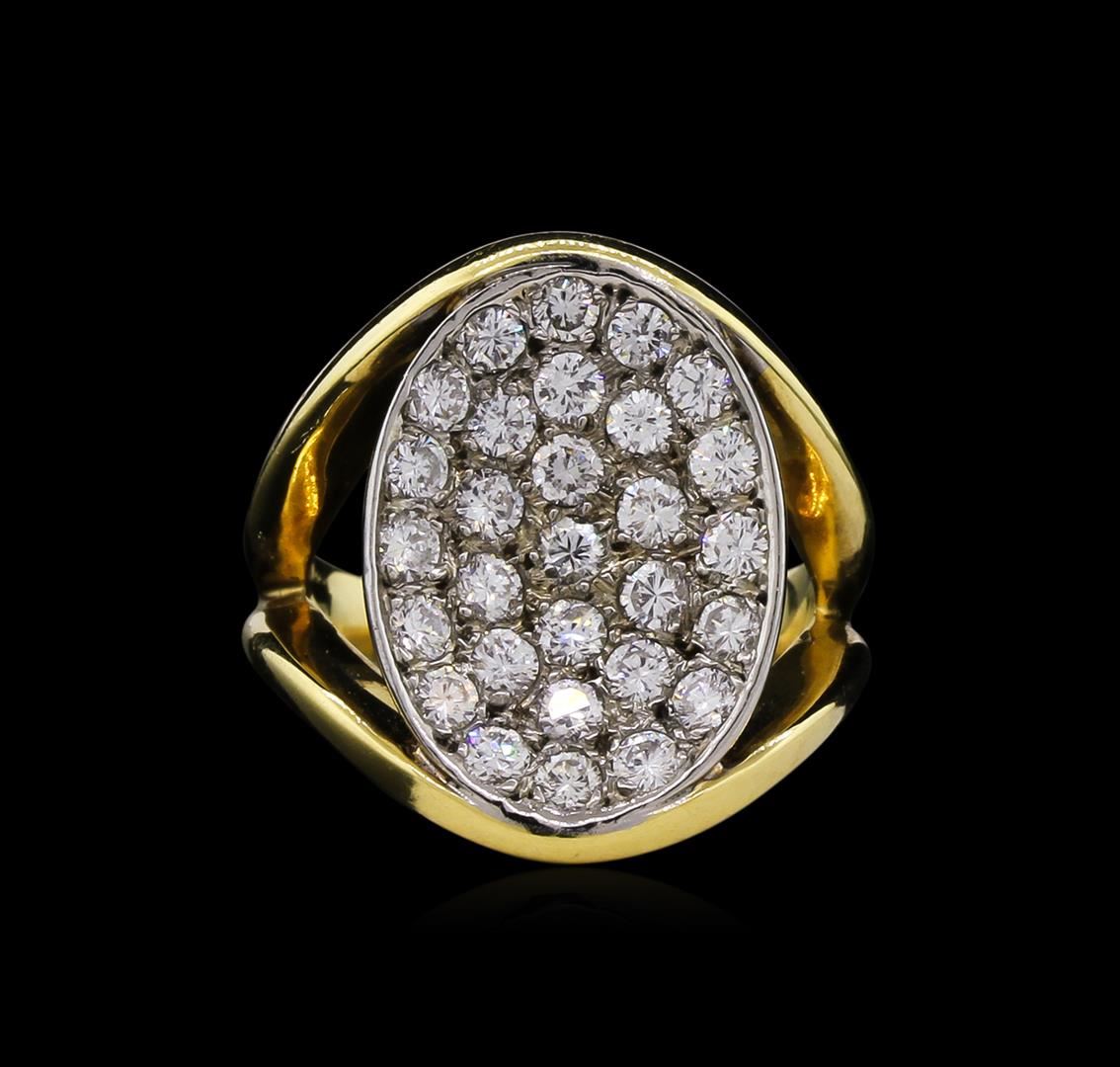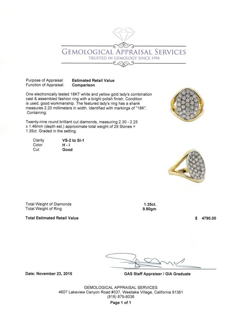 One electronically tested 18KT white and yellow gold lady's combination cast & assembled fashion ring with a bright polish finish. The featured lady's ring has a shank measures 2.20 millimeters in width. Identified with markings of "18K". Condition is used, good workmanship. Containing: Twenty-Nine round brilliant cut diamonds, measuring 2.30 - 2.25 x 1.46mm (depth est.) approximate total weight of 29 Stones = 1.35ct. Graded in the setting. Clarity: VS-2 to SI-1. Color: H - I. Cut Good. Total Weight of Diamonds 1.35ct. Total Weight of Ring 9.80gm. GAS Appraised at $4,790.00.