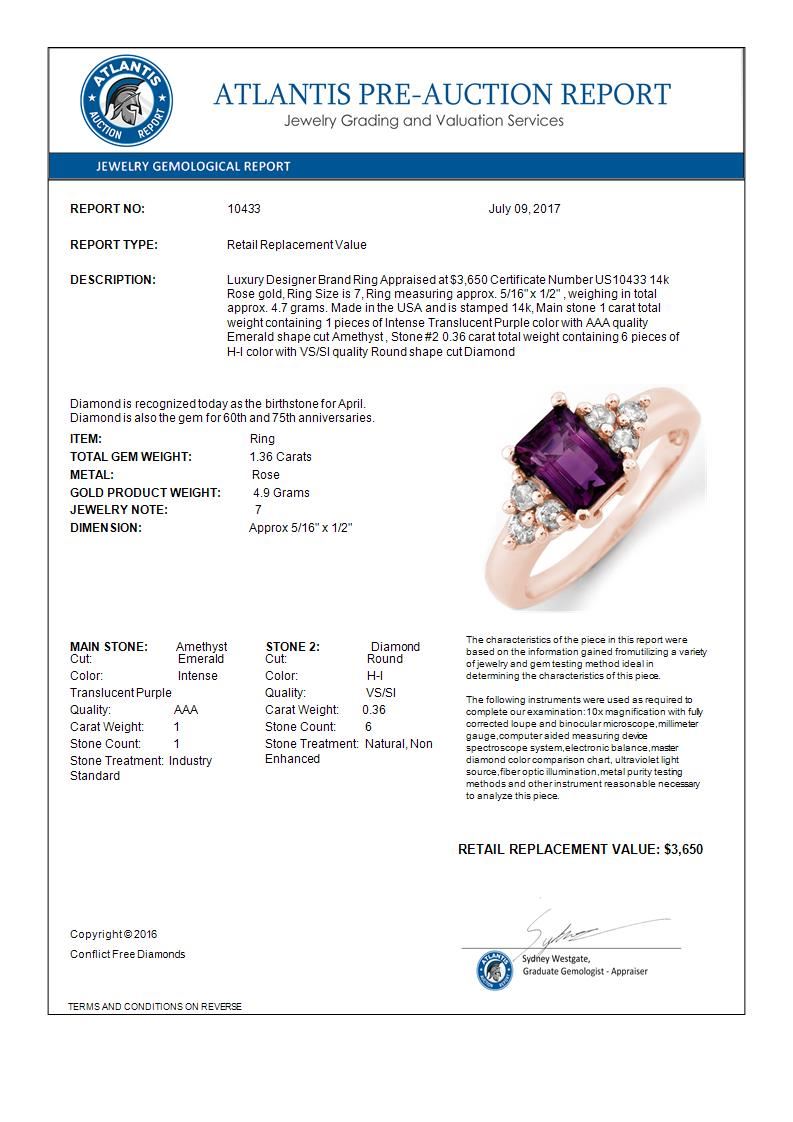 1.36 CTW Amethyst & Diamond Ring 14K Rose Gold ---- Luxury Designer Brand Ring Appraised Retail Price at $3,650 ---- SKU Number US10433 14k Rose gold Ring Size is 7, Ring measuring approx. 5/16" x 1/2" , weighing in total approx. 4.7 grams. Made in the USA and is stamped 14k, Main stone 1 carat total weight containing 1 pieces of Intense Translucent Purple color with AAA quality Emerald shape cut Amethyst , Stone #2 0.36 carat total weight containing 6 pieces of H-I color with VS/SI quality Round shape cut