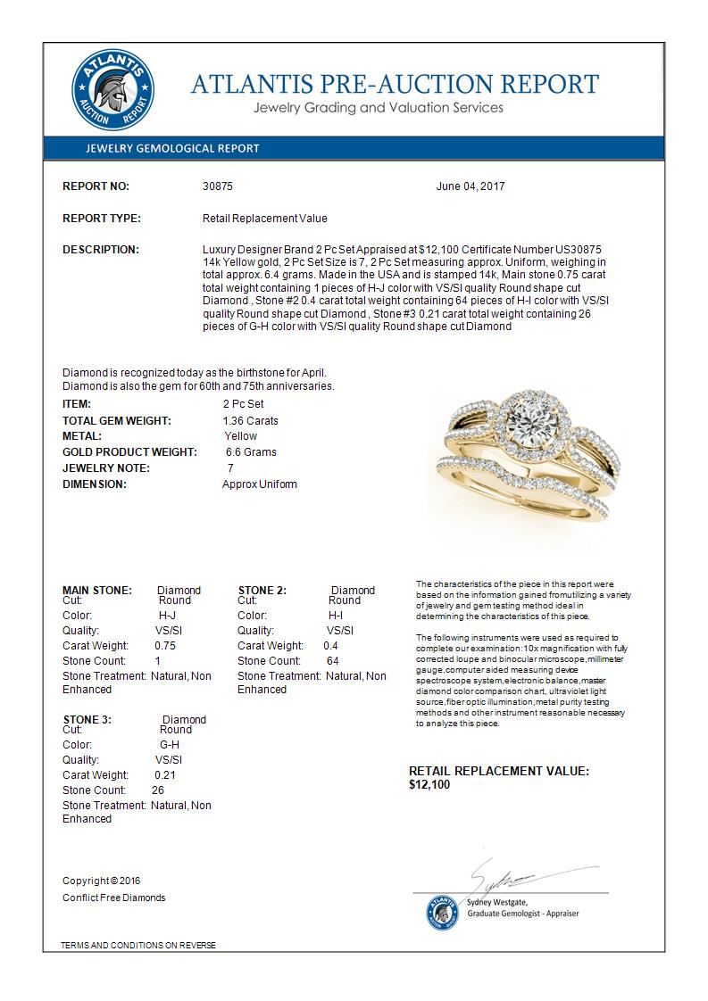 1.36 CTW Certified VS/SI Diamond 2Pc Wedding Set Solitaire Halo 14K Yellow Gold ---- Luxury Designer Brand 2 Pc Set Appraised Retail Price at $12,100 ---- SKU Number US30875 14k Yellow gold 2 Pc Set Size is 7, 2 Pc Set measuring approx. Uniform, weighing in total approx. 6.4 grams. Made in the USA and is stamped 14k, Main stone 0.75 carat total weight containing 1 pieces of H-J color with VS/SI quality Round shape cut Diamond , Stone #2 0.4 carat total weight containing 64 pieces of H-I color with VS/SI quality Round shape cut