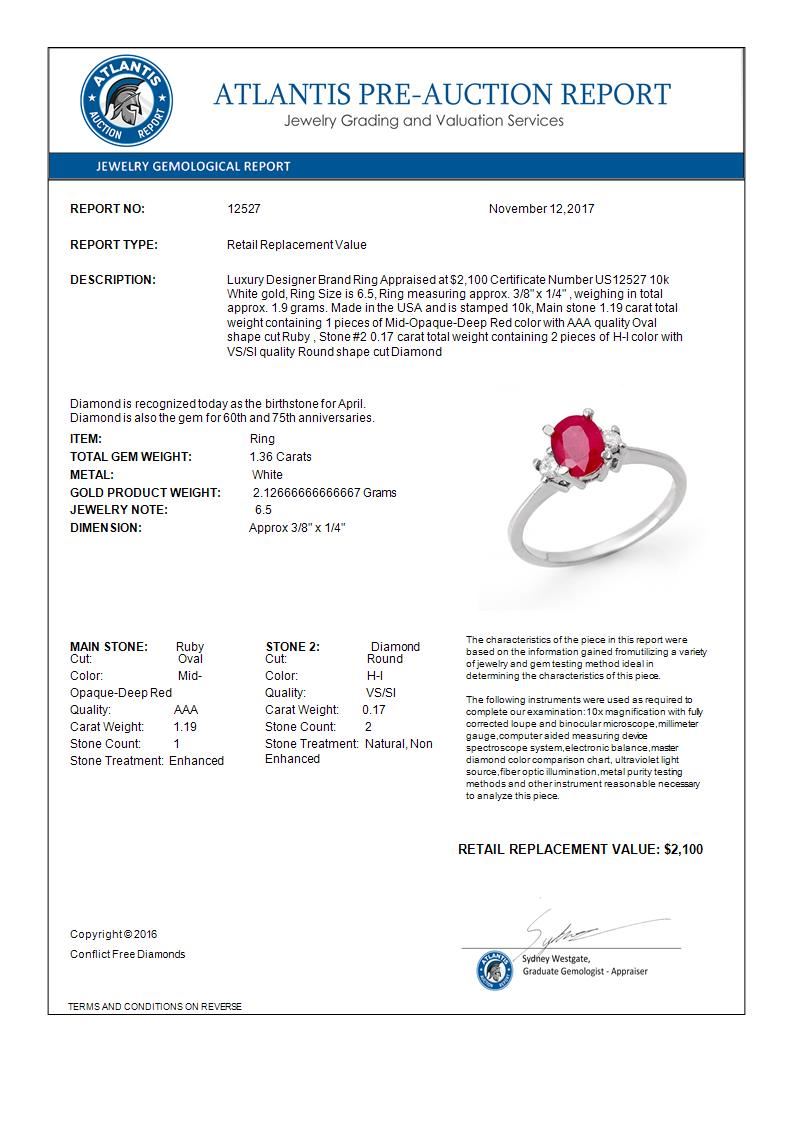 REF-31K8W -12527 ---- 1.36 CTW Ruby & Diamond Ring 10K White Gold ---- Luxury Designer Brand Ring Appraised at $2,100 Certificate Number US12527 10k White gold, Ring Size is 6.5, Ring measuring approx. 3/8" x 1/4" , weighing in total approx. 1.9 grams. Made in the USA and is stamped 10k, Main stone 1.19 carat total weight containing 1 pieces of Mid-Opaque-Deep Red color with AAA quality Oval shape cut Ruby , Stone #2 0.17 carat total weight containing 2 pieces of H-I color with VS/SI quality Round shape cut Diamond