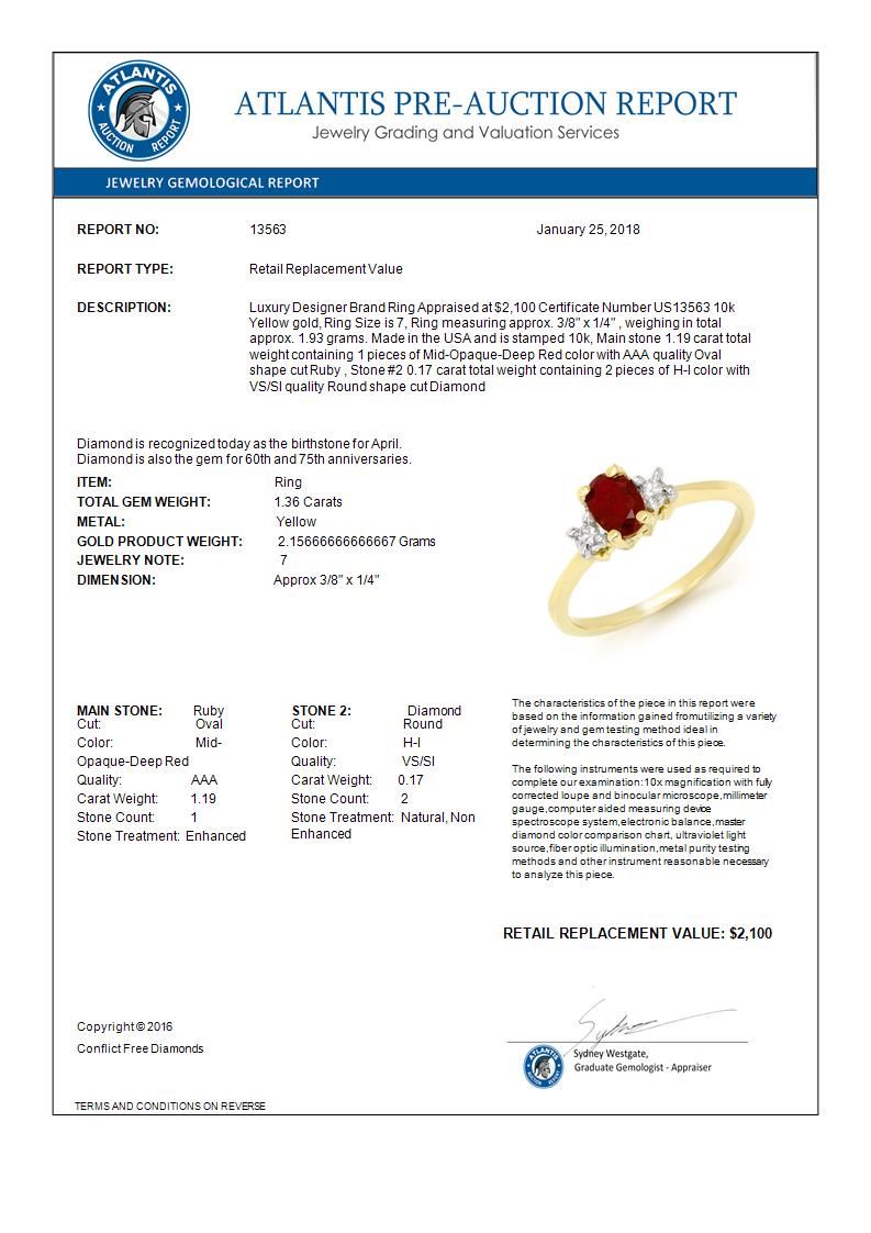REF-31F8N -13563 ---- 1.36 CTW Ruby & Diamond Ring 10K Yellow Gold ---- Luxury Designer Brand Ring Appraised at $2,100 Certificate Number US13563 10k Yellow gold, Ring Size is 7, Ring measuring approx. 3/8" x 1/4" , weighing in total approx. 1.93 grams. Made in the USA and is stamped 10k, Main stone 1.19 carat total weight containing 1 pieces of Mid-Opaque-Deep Red color with AAA quality Oval shape cut Ruby , Stone #2 0.17 carat total weight containing 2 pieces of H-I color with VS/SI quality Round shape cut Diamond