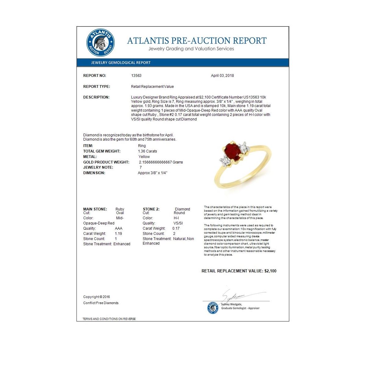 REF-31F8N -13563 ---- 1.36 CTW Ruby & Diamond Ring 10K Yellow Gold ---- Luxury Designer Brand Ring Appraised at $2,100 Certificate Number US13563 10k Yellow gold, Ring Size is 7, Ring measuring approx. 3/8" x 1/4" , weighing in total approx. 1.93 grams. Made in the USA and is stamped 10k, Main stone 1.19 carat total weight containing 1 pieces of Mid-Opaque-Deep Red color with AAA quality Oval shape cut Ruby , Stone #2 0.17 carat total weight containing 2 pieces of H-I color with VS/SI quality Round shape cut Diamond