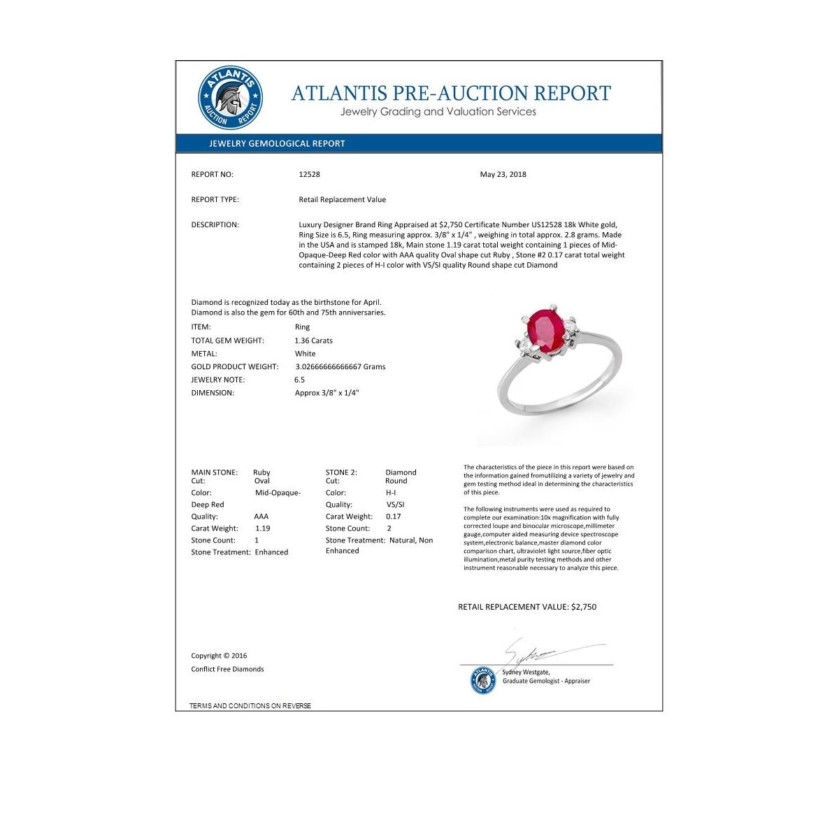 REF-41H8A -12528 ---- 1.36 CTW Ruby & Diamond Ring 18K White Gold ---- Luxury Designer Brand Ring Appraised at $2,750 Certificate Number US12528 18k White gold, Ring Size is 6.5, Ring measuring approx. 3/8" x 1/4" , weighing in total approx. 2.8 grams. Made in the USA and is stamped 18k, Main stone 1.19 carat total weight containing 1 pieces of Mid-Opaque-Deep Red color with AAA quality Oval shape cut Ruby , Stone #2 0.17 carat total weight containing 2 pieces of H-I color with VS/SI quality Round shape cut Diamond