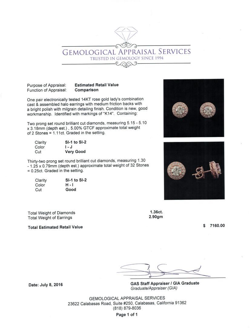 One pair electronically tested 14KT rose gold lady's combination cast & assembled halo earrings with medium friction backs with a bright polish with milgrain detailing finish. Identified with markings of "K14". Condition is new, good workmanship. Containing: Two prong set round brilliant cut diamonds, measuring 5.15 - 5.10 x 3.18mm (depth est.) , 5.00.%. GTCF approximate total weight of 2 Stones = 1.11ct. Graded in the setting. Clarity: SI-1 to SI-2. Color: I - J. Cut Very Good Thirty-Two prong set round brilliant cut diamonds, measuring 1.30 - 1.25 x 0.79mm (depth est.) approximate total weight of 32 Stones = 0.25ct. Graded in the setting. Clarity: SI-1 to SI-2. Color: H - I. Cut Good. Total Weight of Diamonds 1.36ct. Total Weight of Earrings 2.90gm. GAS Appraised.