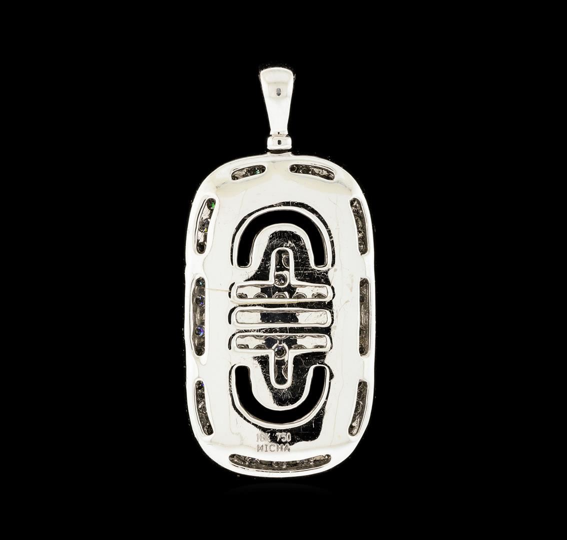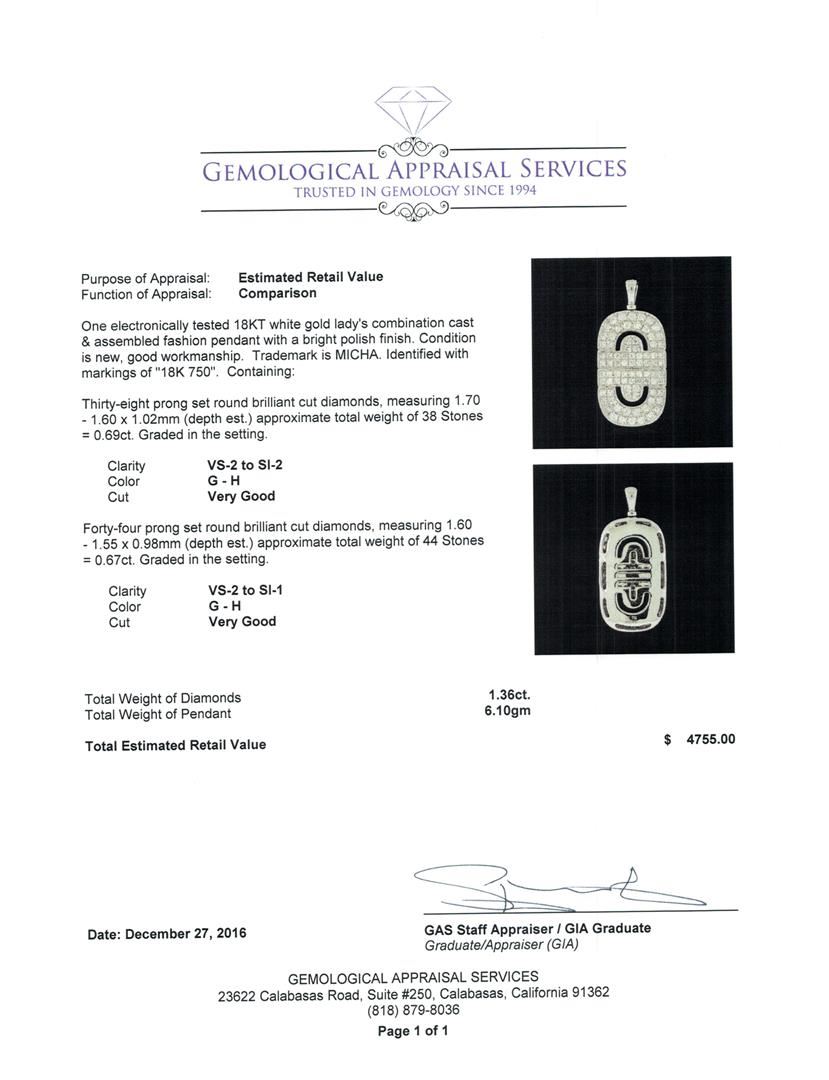 One electronically tested 18KT white gold lady's combination cast & assembled fashion pendant with a bright polish finish. Trademark is MICHA. Identified with markings of '18K 750'. Condition is new, good workmanship. Containing: Thirty-Eight prong set round brilliant cut diamonds, measuring 1.70 - 1.60 x 1.02mm (depth est.) approximate total weight of 38 Stones = 0.69ct. Graded in the setting. Clarity VS-2 to SI-2. Color: G - H Cut Very Good Forty-Four prong set round brilliant cut diamonds, measuring 1.60 - 1.55 x 0.98mm (depth est.) approximate total weight of 44 Stones = 0.67ct. Graded in the setting. Clarity VS-2 to SI-1. Color: G - H Cut Very Good. Total Weight of Diamonds 1.36ct.. Total Weight of Pendant 6.10gm. GAS Appraised at $4,755.00.