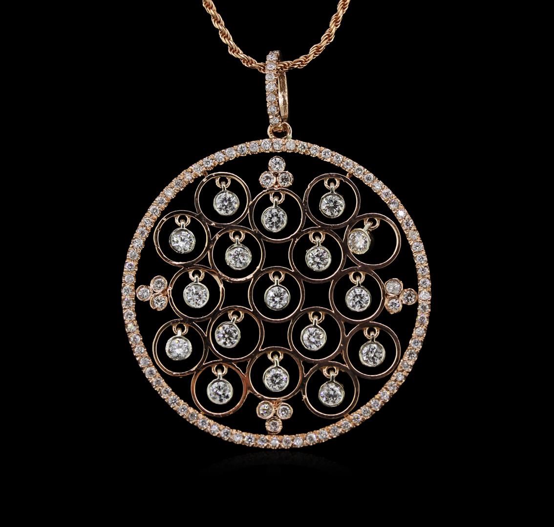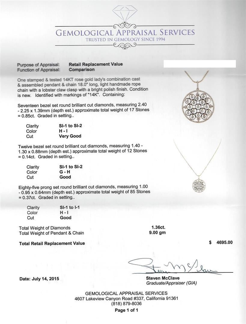 One stamped & tested 14KT rose gold lady's combination cast & assembled pendant & chain 18.0" long, light handmade rope chain with a lobster claw clasp with a bright polish finish. Condition is new. Identified with markings of "14K". Containing: Seventeen bezel set round brilliant cut diamonds, measuring 2.40 - 2.25 x 1.39mm (depth est.) approximate total weight of 17 Stones = 0.85ct. Graded in setting. Clarity: SI-1 to SI-2. Color: H - I. Cut: Very Good. Twelve bezel set round brilliant cut diamonds, measuring 1.40 - 1.30 x 0.88mm (depth est.) approximate total weight of 12 Stones = 0.14ct. Graded in setting. Clarity: SI-1 to SI-2. Color: G - H. Cut: Good. Eighty-five prong set round brilliant cut diamonds, measuring 1.00 - 0.95 x 0.64mm (depth est.) approximate total weight of 85 Stones = 0.37ct. Graded in setting. Clarity: SI-1 to I-1. Color: H - I. Cut: Good. Total Weight of Diamonds: 1.36ct. Total Weight of Pendant & Chain: 9.00 gm. GAS Appraised at $4,695.00.