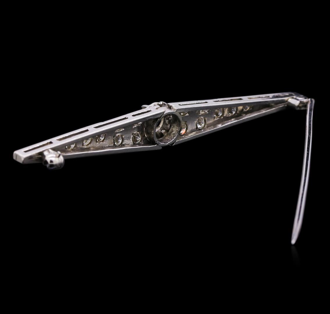One electronically tested 18KT-platinum white gold lady's combination cast & assembled fashion pin with a bright polish with milgrain detailing finish. The featured lady's pin and clutch has a platinum clutch. Condition is new, good workmanship. Containing: One prong set round brilliant cut diamond, measuring 4.30 - 4.29 x 2.75mm (depth est.) approximate weight of 0.33ct. Graded in the setting. Clarity SI-1. Color: H Cut Good Eleven prong set round brilliant cut diamonds, measuring 2.75 - 2.70 x 1.65mm (depth est.) approximate total weight of 11 Stones = 0.82ct. Graded in the setting. Clarity VS-2 to SI-1. Color: H - I Cut Good Three prong set single cut diamonds, measuring 2.70 - 2.60 x 1.60mm (depth est.) approximate total weight of 3 Stones = 0.21ct. Graded in the setting. Clarity VS-2 to SI-1. Color: G - H Cut Good. Total Weight of Diamonds 1.36ct.. Total Weight of Pin 6.60gm. GAS Appraised at $5,735.00.