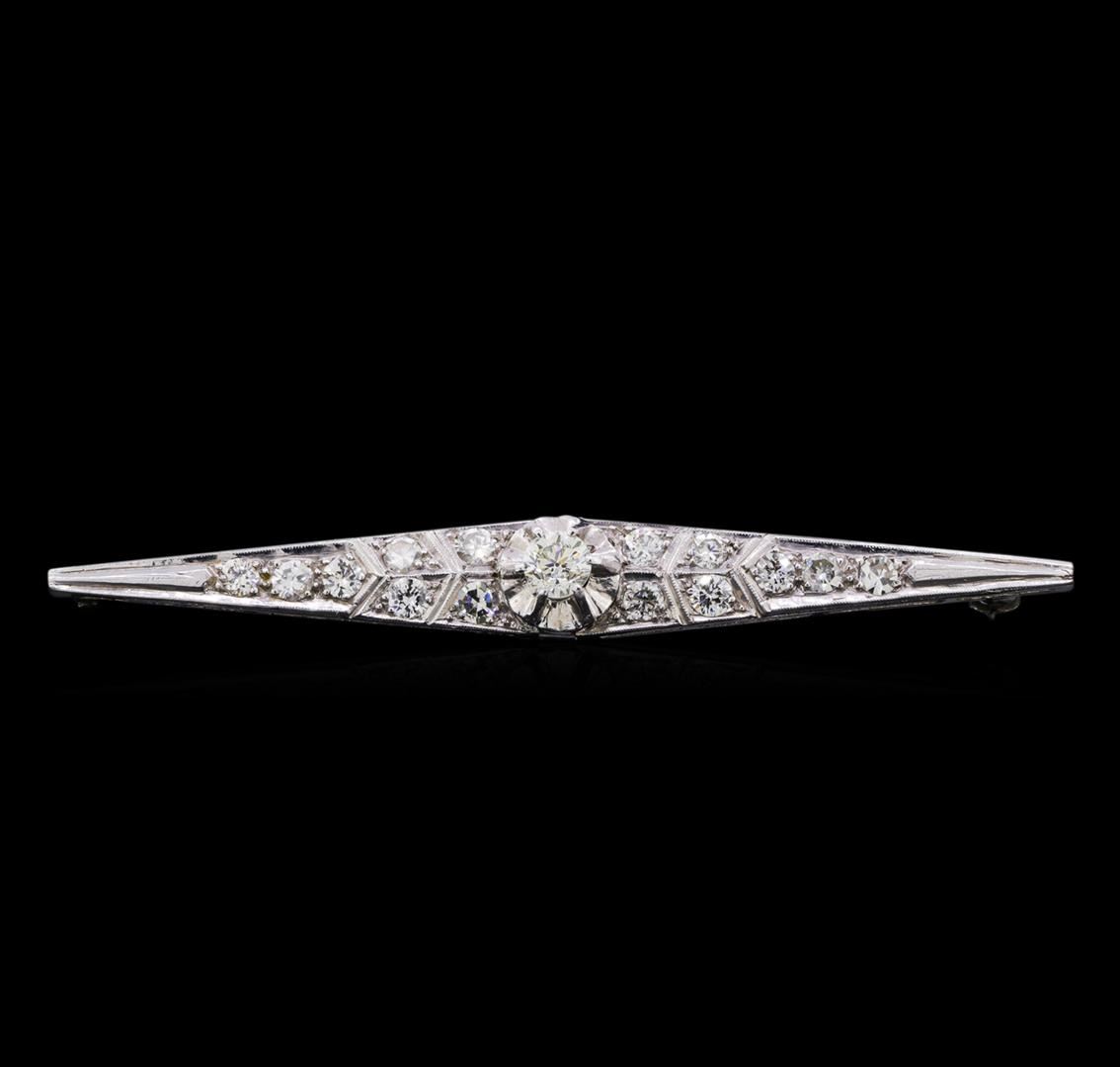 One electronically tested 18KT-platinum white gold lady's combination cast & assembled fashion pin with a bright polish with milgrain detailing finish. The featured lady's pin and clutch has a platinum clutch. Condition is new, good workmanship. Containing: One prong set round brilliant cut diamond, measuring 4.30 - 4.29 x 2.75mm (depth est.) approximate weight of 0.33ct. Graded in the setting. Clarity SI-1. Color: H Cut Good Eleven prong set round brilliant cut diamonds, measuring 2.75 - 2.70 x 1.65mm (depth est.) approximate total weight of 11 Stones = 0.82ct. Graded in the setting. Clarity VS-2 to SI-1. Color: H - I Cut Good Three prong set single cut diamonds, measuring 2.70 - 2.60 x 1.60mm (depth est.) approximate total weight of 3 Stones = 0.21ct. Graded in the setting. Clarity VS-2 to SI-1. Color: G - H Cut Good. Total Weight of Diamonds 1.36ct.. Total Weight of Pin 6.60gm. GAS Appraised at $5,735.00.