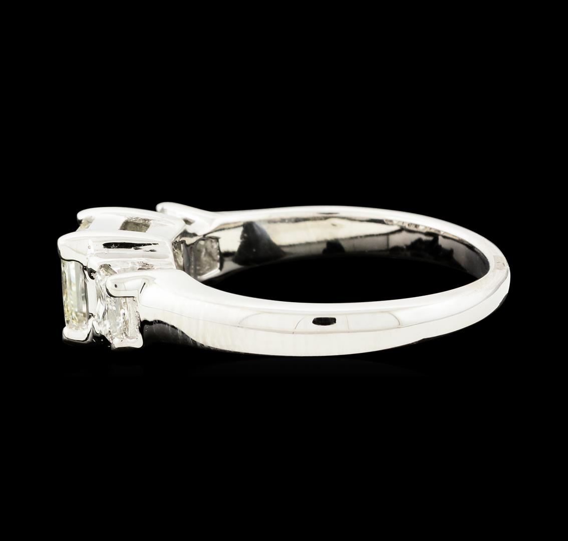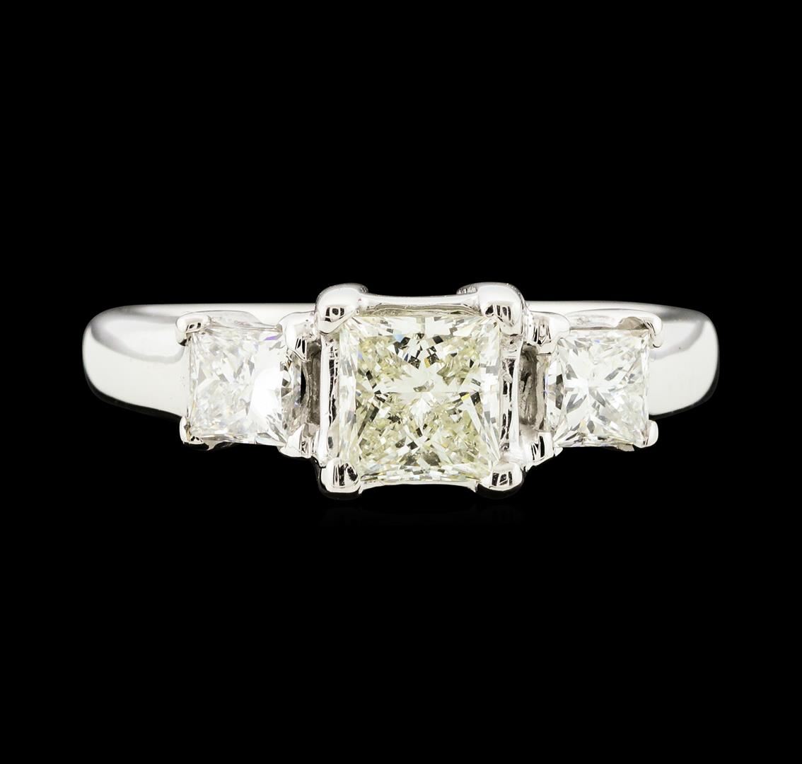 One electronically tested 14KT white gold lady's cast 3-stone wedding ring with a tapered shank with a bright polish finish. The featured lady's ring has a shank measuring 1.90 millimeters wide. Identified with markings of '14K'. Condition is new, good workmanship. Containing: One prong set princess cut diamond, measuring 5.00 x 4.78 x 3.43mm (depth est.) , 10.00.%. GTCF approximate weight of 0.80ct. Graded in the setting. Clarity VS-2. Color: I Cut Very Good Two prong set princess cut diamonds, measuring 3.45 x 3.80 x 2.60mm (depth est.) approximate total weight of 2 Stones = 0.56ct. Graded in the setting. Clarity VS-2 to SI-1. Color: H - I Cut Very Good. Total Weight of Diamonds 1.36ct.. Total Weight of Ring 4.00gm. GAS Appraised at $6,615.00.