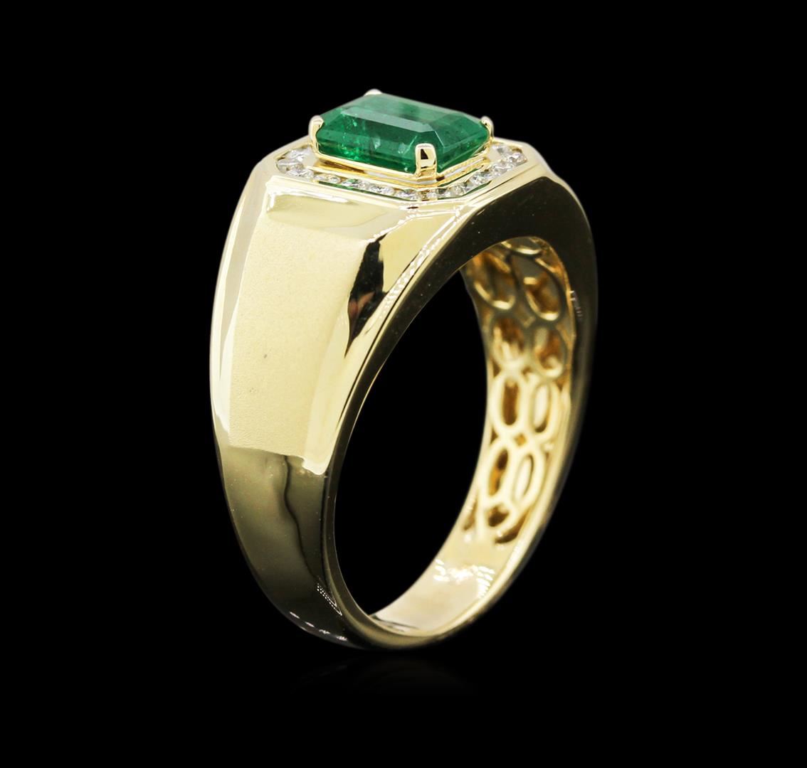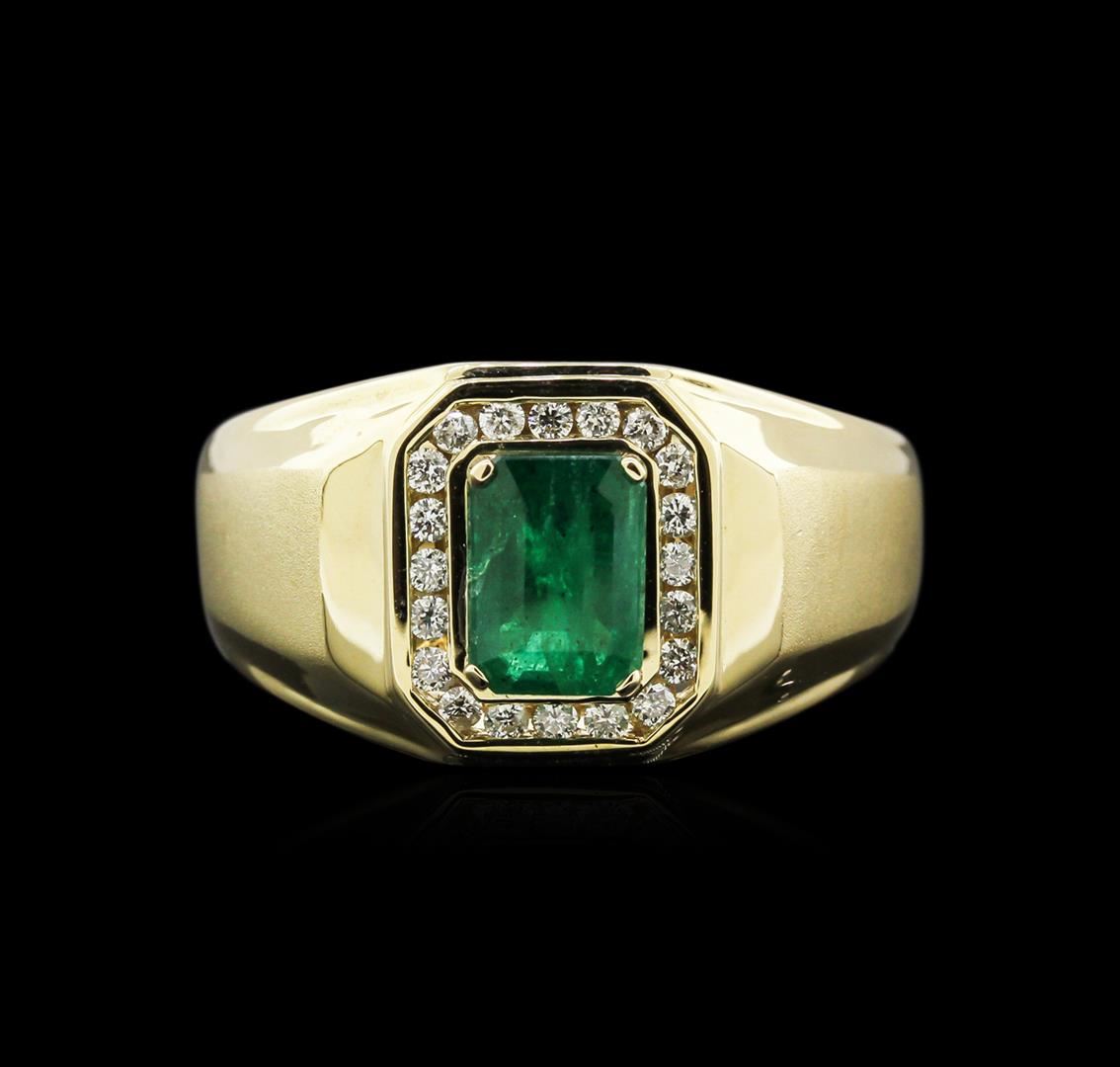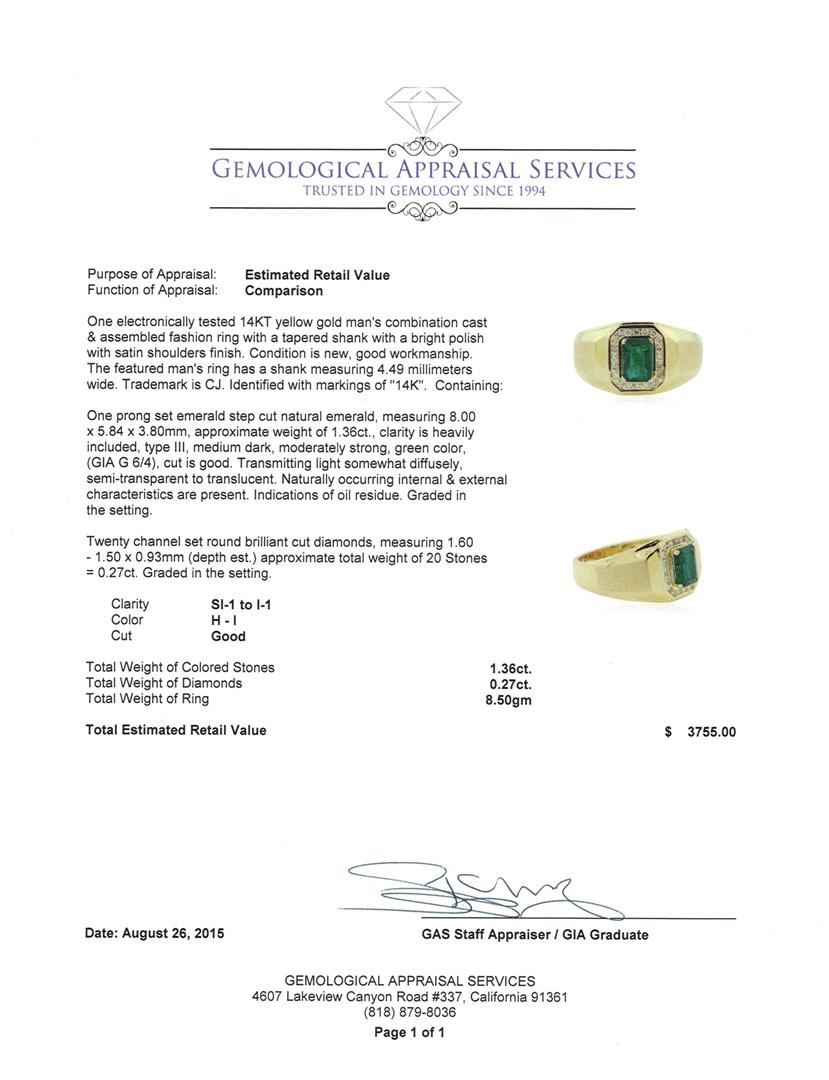 One electronically tested 14KT yellow gold man's combination cast & assembled fashion ring with a tapered shank with a bright polish with satin shoulders finish. The featured man's ring has a shank measuring 4.49 millimeters wide. Trademark is CJ. Identified with markings of "14K". Condition is new, good workmanship. Containing: One prong set emerald step cut natural emerald, measuring 8.00 x 5.84 x 3.80mm, approximate weight of 1.36ct., clarity is heavily included, type III, medium dark, moderately strong, green color, (GIA G 6/4), cut is good. Transmitting light somewhat diffusely, semi-transparent to translucent. Naturally occurring internal & external characteristics are present. Indications of oil residue. Graded in the setting. Twenty channel set round brilliant cut diamonds, measuring 1.60 - 1.50 x 0.93mm (depth est.) approximate total weight of 20 Stones = 0.27ct. Graded in the setting. Clarity: SI-1 to I-1. Color: H - I. Cut Good. Total Weight of Colored Stones 1.36ct. Total Weight of Diamonds 0.27ct. Total Weight of Ring 8.50gm. GAS Appraised at $3,755.00.