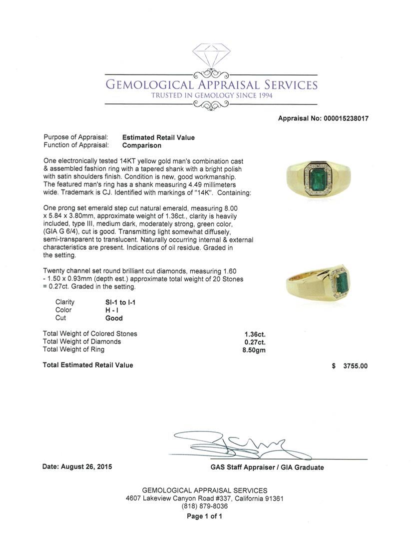 One electronically tested 14KT yellow gold man's combination cast & assembled fashion ring with a tapered shank with a bright polish with satin shoulders finish. The featured man's ring has a shank measuring 4.49 millimeters wide. Trademark is CJ. Identified with markings of "14K". Condition is new, good workmanship. Containing: One prong set emerald step cut natural emerald, measuring 8.00 x 5.84 x 3.80mm, approximate weight of 1.36ct., clarity is heavily included, type III, medium dark, moderately strong, green color, (GIA G 6/4), cut is good. Transmitting light somewhat diffusely, semi-transparent to translucent. Naturally occurring internal & external characteristics are present. Indications of oil residue. Graded in the setting. Twenty channel set round brilliant cut diamonds, measuring 1.60 - 1.50 x 0.93mm (depth est.) approximate total weight of 20 Stones = 0.27ct. Graded in the setting. Clarity: SI-1 to I-1. Color: H - I. Cut Good. Total Weight of Colored Stones 1.36ct. Total Weight of Diamonds 0.27ct. Total Weight of Ring 8.50gm. GAS Appraised at $3,755.00.