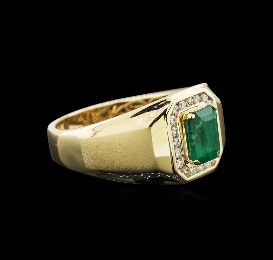 One electronically tested 14KT yellow gold man's combination cast & assembled fashion ring with a tapered shank with a bright polish with satin shoulders finish. The featured man's ring has a shank measuring 4.49 millimeters wide. Trademark is CJ. Identified with markings of "14K". Condition is new, good workmanship. Containing: One prong set emerald step cut natural emerald, measuring 8.00 x 5.84 x 3.80mm, approximate weight of 1.36ct., clarity is heavily included, type III, medium dark, moderately strong, green color, (GIA G 6/4), cut is good. Transmitting light somewhat diffusely, semi-transparent to translucent. Naturally occurring internal & external characteristics are present. Indications of oil residue. Graded in the setting. Twenty channel set round brilliant cut diamonds, measuring 1.60 - 1.50 x 0.93mm (depth est.) approximate total weight of 20 Stones = 0.27ct. Graded in the setting. Clarity: SI-1 to I-1. Color: H - I. Cut Good. Total Weight of Colored Stones 1.36ct. Total Weight of Diamonds 0.27ct. Total Weight of Ring 8.50gm. GAS Appraised at $3,755.00.