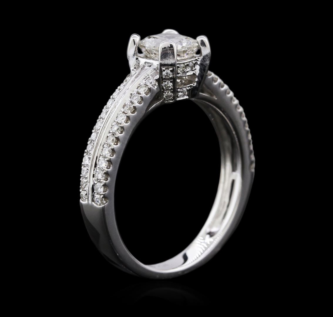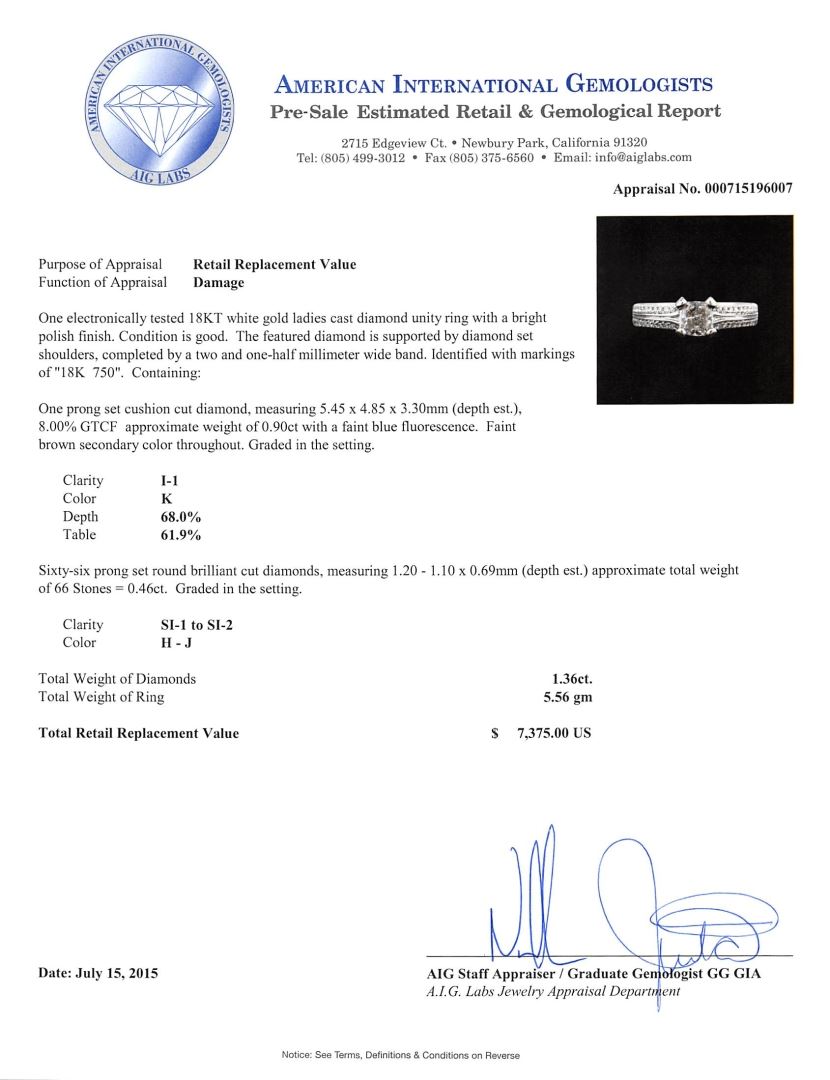 One electronically tested 18KT white gold ladies cast diamond unity ring with a bright polish finish. The featured diamond is supported by diamond set shoulders, completed by a two and one-half millimeter wide band. Identified with markings of "18K 750". Condition is good. Containing: One prong set cushion cut diamond, measuring 5.45 x 4.85 x 3.30mm (depth est.), 8.00.%. GTCF approximate weight of 0.90ct with a faint blue fluorescence. Faint brown secondary color throughout. Graded in the setting. Clarity: I-1. Color: K. Depth 68.0%. Table 61.9%. Sixty-Six prong set round brilliant cut diamonds, measuring 1.20 - 1.10 x 0.69mm (depth est.) approximate total weight of 66 Stones = 0.46ct. Graded in the setting. Clarity: SI-1 to SI-2. Color: H - J. Total Weight of Diamonds 1.36ct. Total Weight of Ring 5.56gm. AIG Appraised at $7,375.00.
