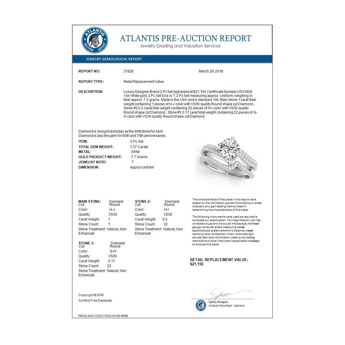 REF-384Y9K -31829 ---- 1.37 CTW Certified VS/SI Diamond Bypass Solitaire 2Pc Wedding Set 14K White Gold ---- Luxury Designer Brand 2 Pc Set Appraised at $21,150 Certificate Number US31829 14k White gold, 2 Pc Set Size is 7, 2 Pc Set measuring approx. Uniform, weighing in total approx. 7.5 grams. Made in the USA and is stamped 14k, Main stone 1 carat total weight containing 1 pieces of H-J color with VS/SI quality Round shape cut Diamond , Stone #2 0.2 carat total weight containing 32 pieces of H-I color with VS/SI quality Round shape cut Diamond , Stone #3 0.17 carat total weight containing 22 pieces of G-H color with VS/SI quality Round shape cut Diamond