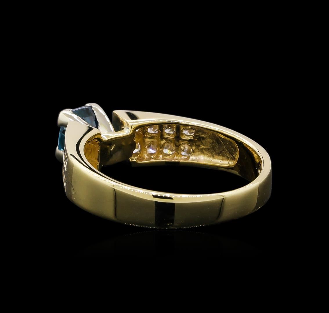 One ring : 14KT yellow gold weighing 4.78gm containing one blue zircon with a total weight of 1.37ct and diamonds weighing 0.5ctw.