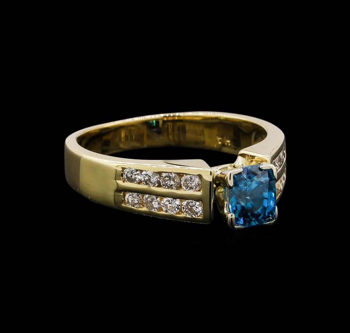 One ring : 14KT yellow gold weighing 4.78gm containing one blue zircon with a total weight of 1.37ct and diamonds weighing 0.5ctw.