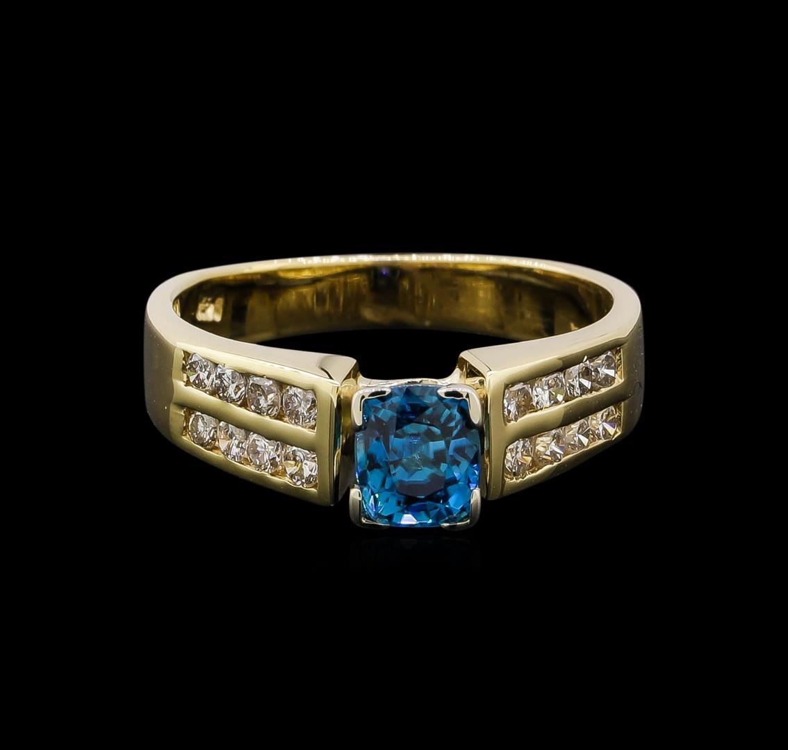 One ring : 14KT yellow gold weighing 4.78gm containing one blue zircon with a total weight of 1.37ct and diamonds weighing 0.5ctw.