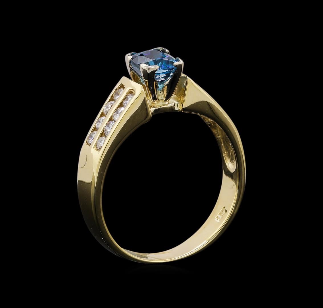 One ring : 14KT yellow gold weighing 4.78gm containing one blue zircon with a total weight of 1.37ct and diamonds weighing 0.5ctw.