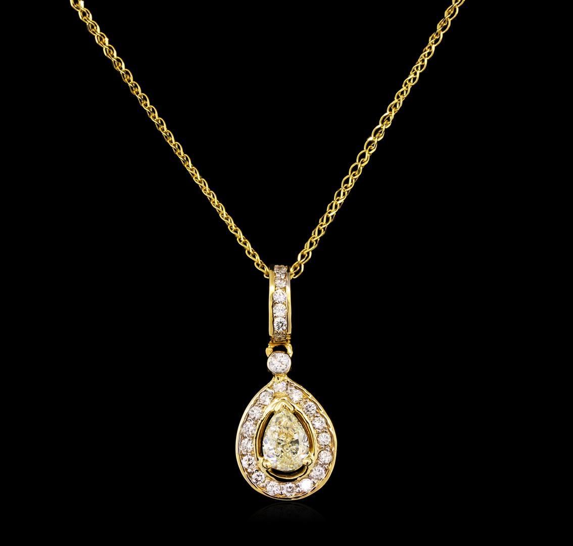 One electronically tested 14KT yellow gold lady's combination cast & assembled drop style pendant & chain 18.0" long, 1.35mm diamond cut twisted cable link with a lobster claw clasp with a bright polish finish. Identified with markings of "14K". Condition is new, good workmanship. Containing: One prong set pear shaped cut diamond, measuring 7.25 x 5.09 x 3.50mm (depth est.), 25.00.%. GTCF approximate weight of 1.00 ct. Graded in the setting. Clarity: VS-2 Cut Good One bezel set round brilliant cut diamond, measuring 2.20 - 2.10 x 1.39mm (depth est.) approximate weight of 0.04ct. Graded in the setting. Clarity: SI-2. Color: Good Twenty-Two prong set round brilliant cut diamonds, measuring 1.60 - 1.50 x 1.01mm (depth est.) approximate total weight of 22 Stones = 0.33ct. Graded in the setting. Clarity: VS-2 to SI-2. Color: H - I. Cut Good. Total Weight of Diamonds 1.37ct. Total Weight of Pendant & Chain 5.00gm. GAS Appraised.