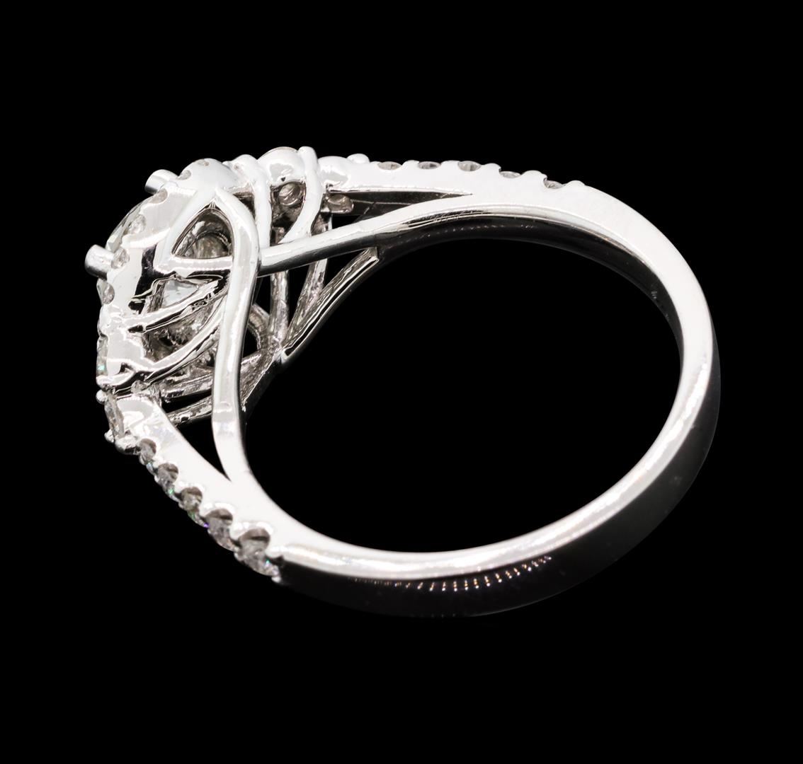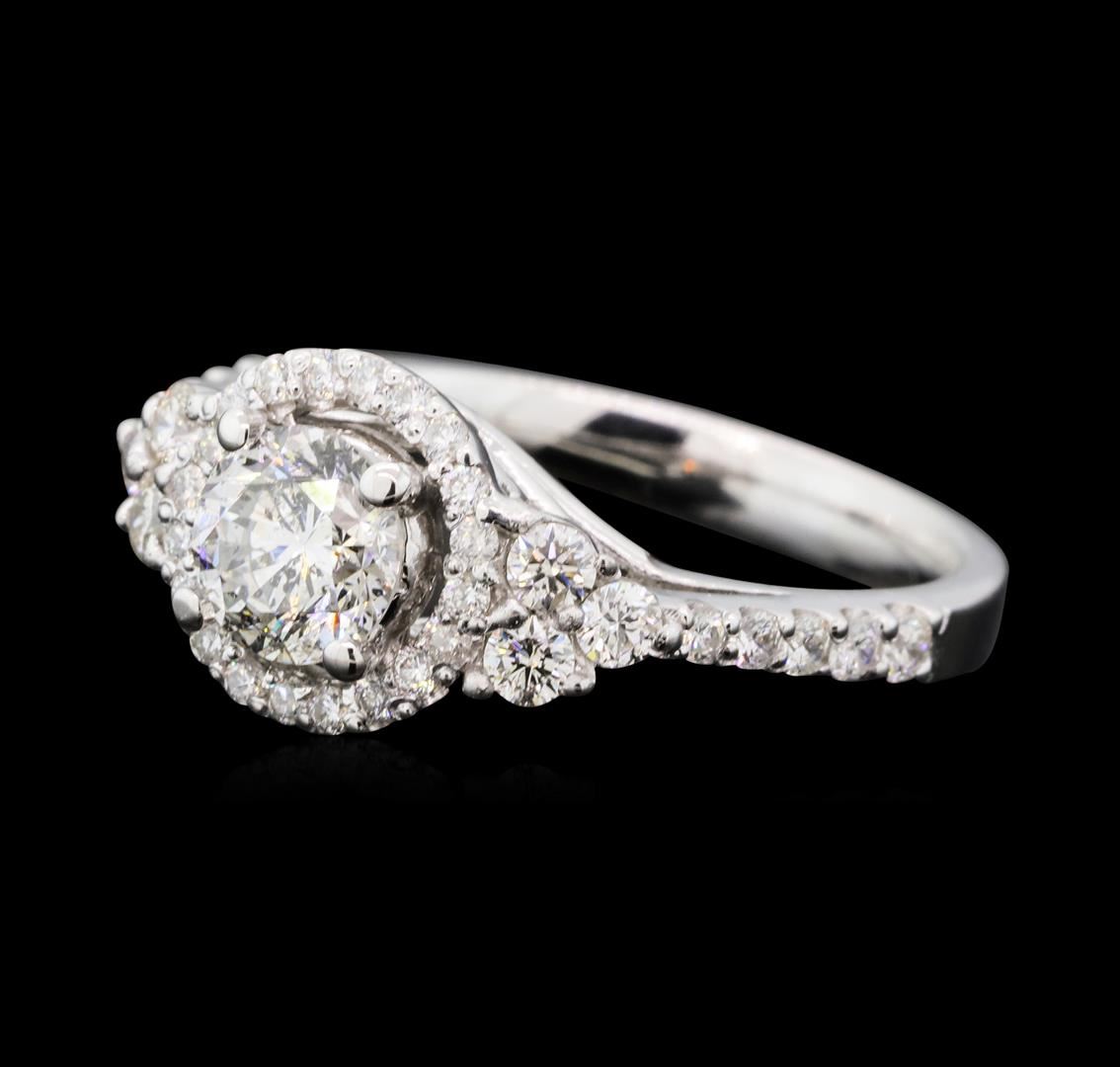One electronically tested 14KT white gold lady's cast wedding ring with a basket halo with a bright polish finish. The featured lady's ring has a shank measuring 2.85 millimeters wide. Identified with markings of 'K14'. Condition is new, good workmanship. Containing: One prong set round brilliant cut diamond, measuring 5.81 - 5.76 x 3.65mm (depth est.) , 5.00.%. GTCF approximate weight of 0.77ct. Graded in the setting. Color H - I Clarity I-1 Cut Good Six prong set round brilliant cut diamonds, measuring 2.40 - 2.30 x 1.46mm (depth est.) approximate total weight of 6 Stones = 0.30ct. Graded in the setting. Color H - I Clarity SI-1 to SI-2 Cut Good Ten prong set round brilliant cut diamonds, measuring 1.85 - 1.40 x 1.01mm (depth est.) approximate total weight of 10 Stones = 0.18ct. Graded in the setting. Color G - I Clarity SI-1 to SI-2 Cut Good Twenty prong set round brilliant cut diamonds, measuring 1.20 - 1.15 x 0.73mm (depth est.) approximate total weight of 20 Stones = 0.12ct. Graded in the setting. Color H - I Clarity SI-1 to I-1 Cut Good. Total Weight of Diamonds 1.37ct.. Total Weight of Ring 4.30gm GAS Appraised at $7,410.00.