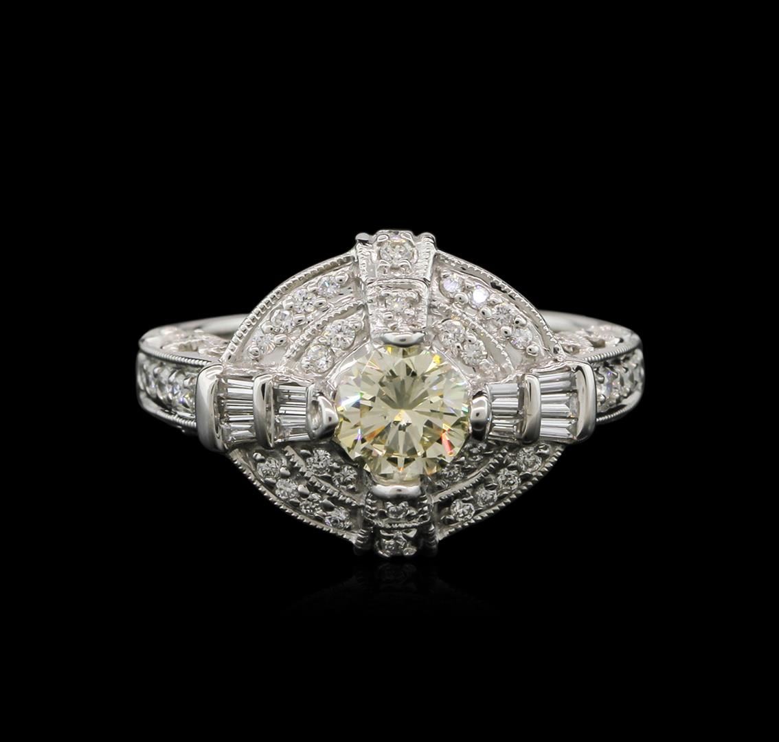 One electronically tested 14KT white gold ladies cast diamond engagement ring with a bright polish finish. Identified with markings of "14K". Condition is new. Containing: One prong set round brilliant cut diamond, measuring 5.40 - 5.40 x 3.24mm (depth est.) approximate weight of 0.69ct. Clarity: SI-1, Cut is Good. Ten channel set baguette cut (tapered) diamonds, measuring 2.00 x 1.30 x 1.11mm (depth est.) approximate total weight of 10 Stones = 0.26ct. Clarity: VS-2. Color: I - J, Cut is Good. Fifty-Two prong set round brilliant cut diamonds, measuring 1.30 - 1.30 x 0.78mm (depth est.) approximate total weight of 52 Stones = 0.42ct. Clarity: SI-2 to I-1. Color: J - K, Cut is Good. Diamonds are graded in the mounting, unless otherwise stated. Total Weight of Diamonds 1.37ct. Total Weight of Engagement Ring 6.00 grams. GGL Appraised at $4,215.00.