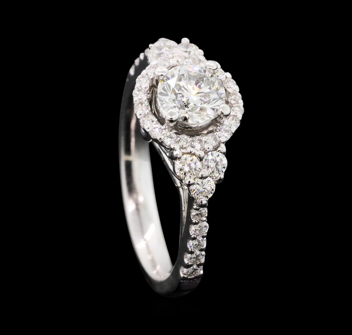 One electronically tested 14KT white gold lady's cast wedding ring with a basket halo with a bright polish finish. The featured lady's ring has a shank measuring 2.85 millimeters wide. Identified with markings of 'K14'. Condition is new, good workmanship. Containing: One prong set round brilliant cut diamond, measuring 5.81 - 5.76 x 3.65mm (depth est.) , 5.00.%. GTCF approximate weight of 0.77ct. Graded in the setting. Color H - I Clarity I-1 Cut Good Six prong set round brilliant cut diamonds, measuring 2.40 - 2.30 x 1.46mm (depth est.) approximate total weight of 6 Stones = 0.30ct. Graded in the setting. Color H - I Clarity SI-1 to SI-2 Cut Good Ten prong set round brilliant cut diamonds, measuring 1.85 - 1.40 x 1.01mm (depth est.) approximate total weight of 10 Stones = 0.18ct. Graded in the setting. Color G - I Clarity SI-1 to SI-2 Cut Good Twenty prong set round brilliant cut diamonds, measuring 1.20 - 1.15 x 0.73mm (depth est.) approximate total weight of 20 Stones = 0.12ct. Graded in the setting. Color H - I Clarity SI-1 to I-1 Cut Good. Total Weight of Diamonds 1.37ct.. Total Weight of Ring 4.30gm GAS Appraised at $7,410.00.