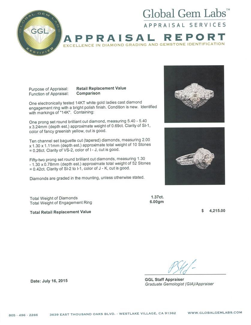 One electronically tested 14KT white gold ladies cast diamond engagement ring with a bright polish finish. Identified with markings of "14K". Condition is new. Containing: One prong set round brilliant cut diamond, measuring 5.40 - 5.40 x 3.24mm (depth est.) approximate weight of 0.69ct. Clarity: SI-1, Cut is Good. Ten channel set baguette cut (tapered) diamonds, measuring 2.00 x 1.30 x 1.11mm (depth est.) approximate total weight of 10 Stones = 0.26ct. Clarity: VS-2. Color: I - J, Cut is Good. Fifty-Two prong set round brilliant cut diamonds, measuring 1.30 - 1.30 x 0.78mm (depth est.) approximate total weight of 52 Stones = 0.42ct. Clarity: SI-2 to I-1. Color: J - K, Cut is Good. Diamonds are graded in the mounting, unless otherwise stated. Total Weight of Diamonds 1.37ct. Total Weight of Engagement Ring 6.00 grams. GGL Appraised at $4,215.00.