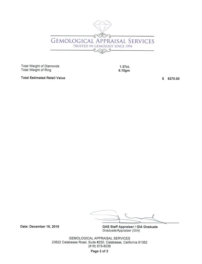 One electronically tested 18KT white gold lady's cast wedding ring with a cathedral shank with a bright polish with milgrain detailing finish. The featured lady's ring has hand engraved details and a shank measuring 2.70 millimeters wide. Identified with markings of '18K 750'. Condition is new, good workmanship. Containing: One prong set round brilliant cut diamond, measuring 5.70 - 5.68 x 3.58mm (depth est.) approximate weight of 0.76ct. Graded in the setting. Clarity SI-2. Color: J Cut Good Eight channel set step trapezoid cut diamonds, measuring 3.70 x 1.30 x 1.00mm (depth est.) approximate total weight of 8 Stones = 0.51ct. Graded in the setting. Clarity VS-1 to VS-2. Color: G - H Cut Very Good Two prong set round brilliant cut diamonds, measuring 2.00 - 1.95 x 1.23mm (depth est.) approximate total weight of 2 Stones = 0.06ct. Graded in the setting. Clarity VS-1 to VS-2. Color: G - H Cut Very Good Four prong set round brilliant cut diamonds, measuring 1.40 - 1.35 x 0.86mm (depth est.) approximate total weight of 4 Stones = 0.04ct. Graded in the setting. Clarity VS-2 to SI-1. Color: G - H Cut Good. Total Weight of Diamonds 1.37ct.. Total Weight of Ring 6.10gm. GAS Appraised at $8,270.00.
