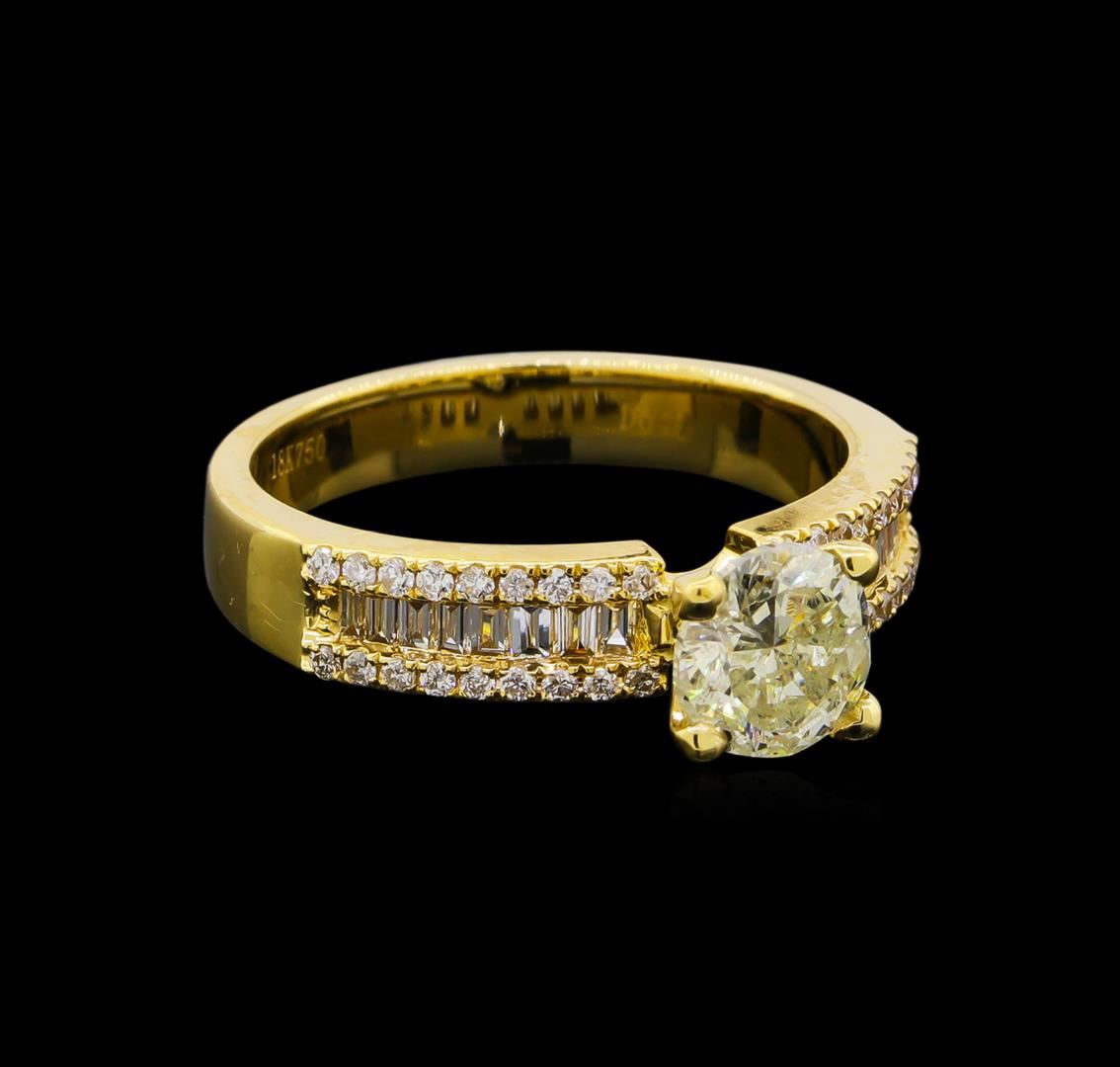 One electronically tested 18KT yellow gold ladies cast & assembled diamond unity ring with a bright finish. The featured diamond is set within mirroring diamond shoulders, completed by a three millimeter wide band. Identified with markings of "18K". Condition is new, good workmanship. Containing: One prong set round brilliant cut diamond, measuring 6.20 - 6.20 x 3.50mm (depth est.), 16.00.%. GTCF approximate weight of 0.97ct with a strong blue fluorescence. Graded in the setting. Clarity: I-2. Color: 56.5%. Table 69.4%. Fifty-Two channel and prong set round & baguette cut diamonds approximate total weight of 52 Stones = 0.40ct. Graded in the setting. Clarity: VS-2 to SI-2. Color: G - H. Total Weight of Diamonds 1.37ct. Total Weight of Ring 5.15gm. AIG Appraised at $9,400.00.