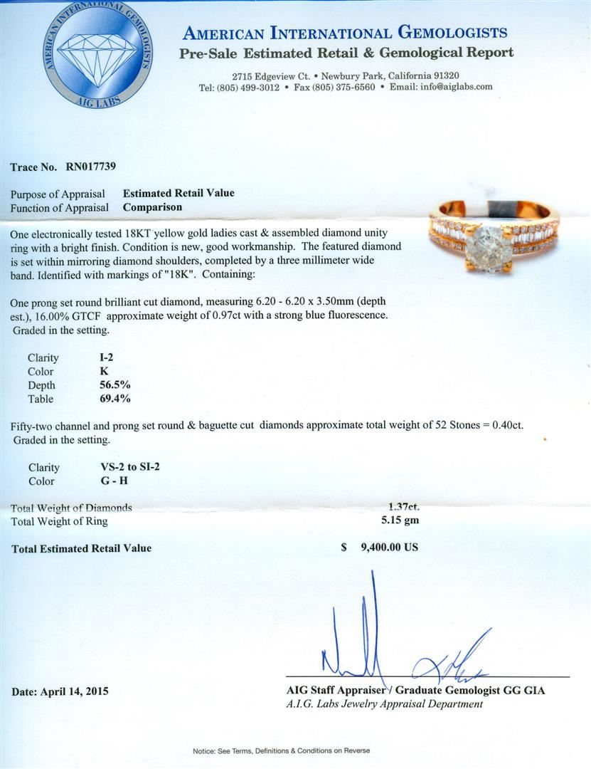 One electronically tested 18KT yellow gold ladies cast & assembled diamond unity ring with a bright finish. The featured diamond is set within mirroring diamond shoulders, completed by a three millimeter wide band. Identified with markings of "18K". Condition is new, good workmanship. Containing: One prong set round brilliant cut diamond, measuring 6.20 - 6.20 x 3.50mm (depth est.), 16.00.%. GTCF approximate weight of 0.97ct with a strong blue fluorescence. Graded in the setting. Clarity: I-2. Color: 56.5%. Table 69.4%. Fifty-Two channel and prong set round & baguette cut diamonds approximate total weight of 52 Stones = 0.40ct. Graded in the setting. Clarity: VS-2 to SI-2. Color: G - H. Total Weight of Diamonds 1.37ct. Total Weight of Ring 5.15gm. AIG Appraised at $9,400.00.