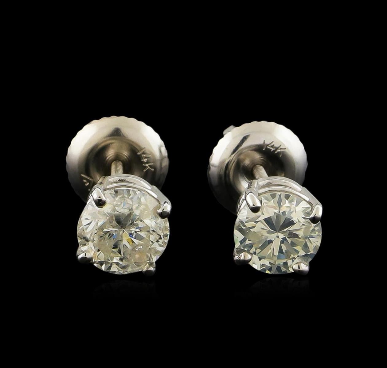 One pair electronically tested 14KT white gold cast & assembled diamond solitaire earrings with screw backs. Identified with markings of "14K". Condition is new, good workmanship. Containing: One prong set round brilliant cut diamond, measuring 5.50 - 5.40 x 3.30mm (depth est.), 3.00.%. GTCF approximate weight of 0.62ct with a faint green fluorescence. Graded in the setting. Clarity: I-1. Color: 60.6%. Table 62.4%. One prong set round brilliant cut diamond, measuring 5.75 - 5.65 x 3.70mm (depth est.), 2.00.%. GTCF approximate weight of 0.75ct with a faint blue fluorescence. Graded in the setting. Clarity: I-2. Color: I. Depth 64.9%. Table 61.1%. Total Weight of Diamonds 1.37ct. Total Weight of Earrings 1.10gm. AIG Appraised.
