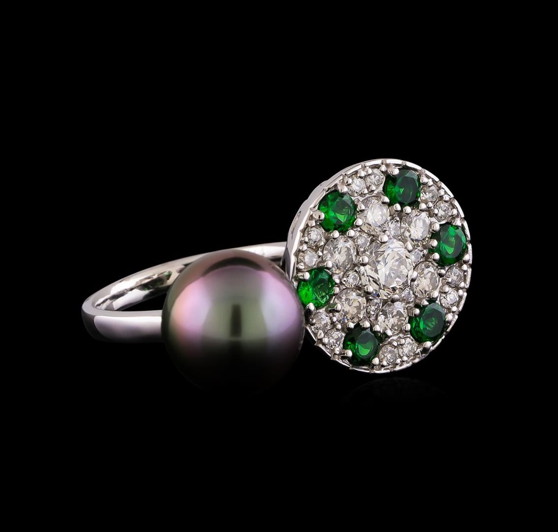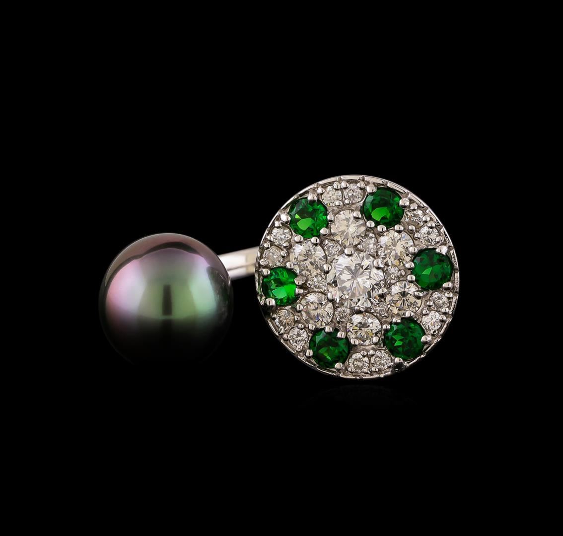 One electronically tested 14KT white gold lady's cast fashion ring with a bright polish finish. The featured lady's ring has a cuff motif with a shank measuring 2.40 millimeters wide. Identified with markings of "K14". Condition is new, good workmanship. Containing: One Tahitian pearl, 11.4mm to 11.1mm in size. The pearl is black in color, green overtone with a good luster, round to near round, and clean. Graded in the setting. Six prong set round modified brilliant cut natural tsavorite garnets, measuring 3.20 - 3.10 x 2.06 mm, (depth est.) approximate total weight of 0.90ct., clarity is eye clean, medium dark, moderately strong, green color, (GIA G 6/4), cut is very good. Transmitting light with no distortion, transparent. Colored gemstones are presumed to have been subjected to commonly used enhancement processes. Graded in the setting. One prong set round brilliant cut diamond, measuring 5.08 - 4.95 x 3.16mm (depth est.) , 5.00.%. GTCF approximate weight of 0.50ct. Graded in the setting. Clarity: SI-1. Color: H - I. Cut Very Good Six prong set round brilliant cut diamonds, measuring 3.00 - 2.90 x 1.83mm (depth est.) approximate total weight of 6 Stones = 0.58ct. Graded in the setting. Clarity: VS-2 to SI-2. Color: H - I. Cut Good Twelve prong set round brilliant cut diamonds, measuring 1.70 - 1.65 x 1.04mm (depth est.) approximate total weight of 12 Stones = 0.22ct. Graded in the setting. Clarity: SI-1 to SI-2. Color: G - Good Six prong set round brilliant cut diamonds, measuring 1.50 - 1.40 x 0.90mm (depth est.) approximate total weight of 6 Stones = 0.07ct. Clarity: SI-1 to SI-2. Color: G - Good. Total Weight of Colored Stones 0.90ct. Total Weight of Diamonds 1.37ct. Total Weight of Ring 8.00gm. GAS Appraised at $8,355.00.