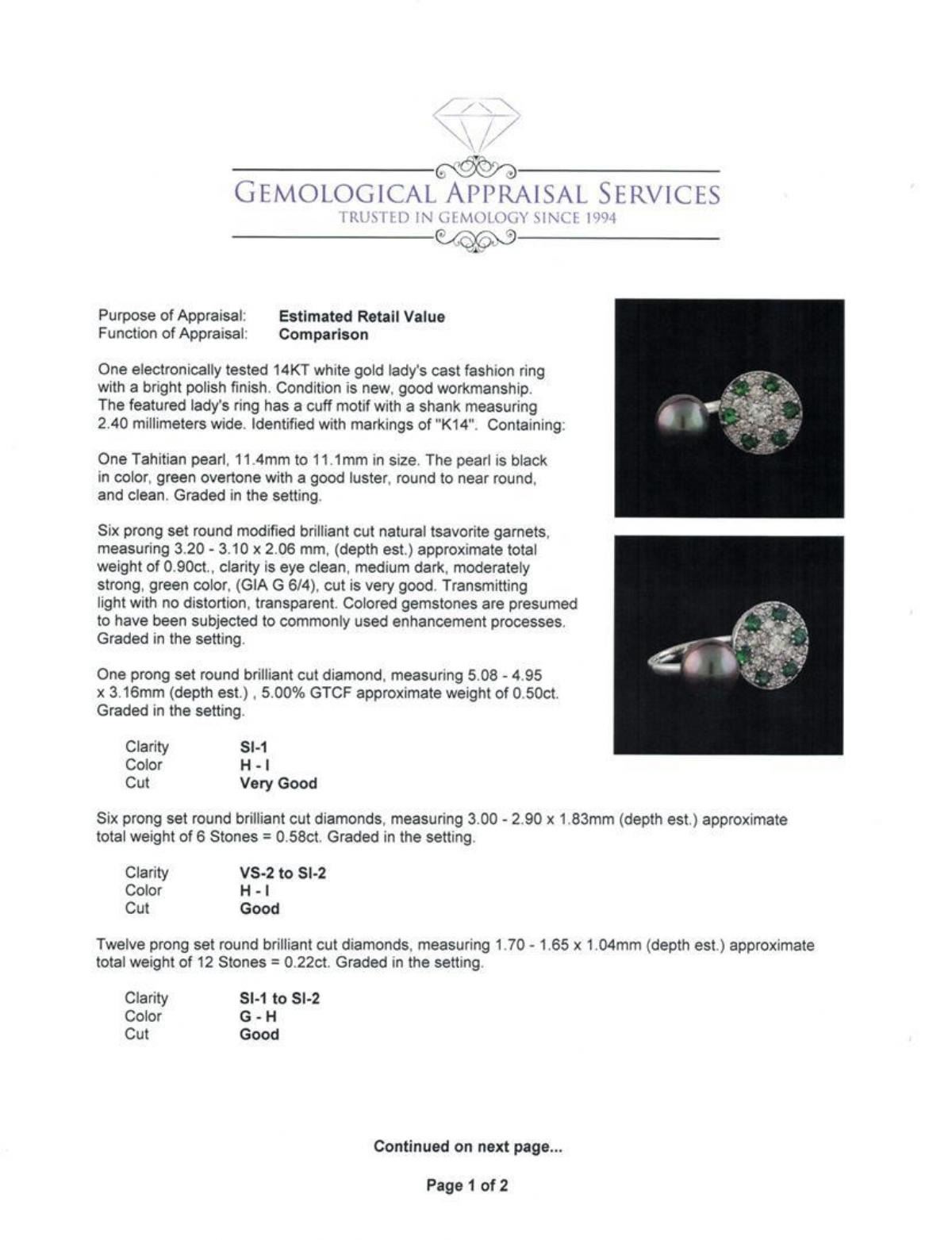 One electronically tested 14KT white gold lady's cast fashion ring with a bright polish finish. The featured lady's ring has a cuff motif with a shank measuring 2.40 millimeters wide. Identified with markings of "K14". Condition is new, good workmanship. Containing: One Tahitian pearl, 11.4mm to 11.1mm in size. The pearl is black in color, green overtone with a good luster, round to near round, and clean. Graded in the setting. Six prong set round modified brilliant cut natural tsavorite garnets, measuring 3.20 - 3.10 x 2.06 mm, (depth est.) approximate total weight of 0.90ct., clarity is eye clean, medium dark, moderately strong, green color, (GIA G 6/4), cut is very good. Transmitting light with no distortion, transparent. Colored gemstones are presumed to have been subjected to commonly used enhancement processes. Graded in the setting. One prong set round brilliant cut diamond, measuring 5.08 - 4.95 x 3.16mm (depth est.) , 5.00.%. GTCF approximate weight of 0.50ct. Graded in the setting. Clarity: SI-1. Color: H - I. Cut Very Good Six prong set round brilliant cut diamonds, measuring 3.00 - 2.90 x 1.83mm (depth est.) approximate total weight of 6 Stones = 0.58ct. Graded in the setting. Clarity: VS-2 to SI-2. Color: H - I. Cut Good Twelve prong set round brilliant cut diamonds, measuring 1.70 - 1.65 x 1.04mm (depth est.) approximate total weight of 12 Stones = 0.22ct. Graded in the setting. Clarity: SI-1 to SI-2. Color: G - Good Six prong set round brilliant cut diamonds, measuring 1.50 - 1.40 x 0.90mm (depth est.) approximate total weight of 6 Stones = 0.07ct. Clarity: SI-1 to SI-2. Color: G - Good. Total Weight of Colored Stones 0.90ct. Total Weight of Diamonds 1.37ct. Total Weight of Ring 8.00gm. GAS Appraised.