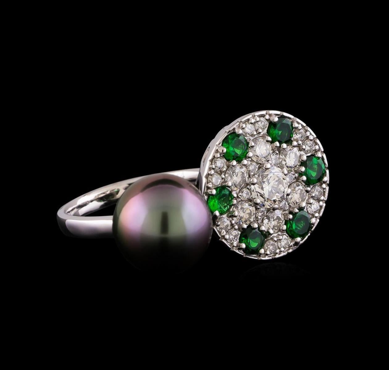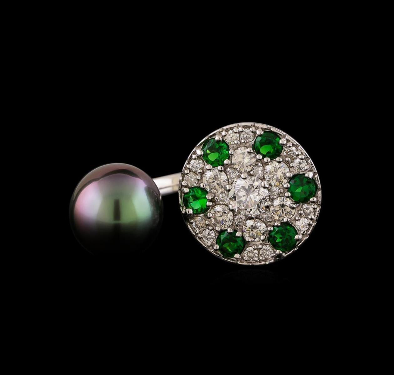 1.37 ctw Diamond, Tsavorite and Pearl Ring - 14KT White Gold