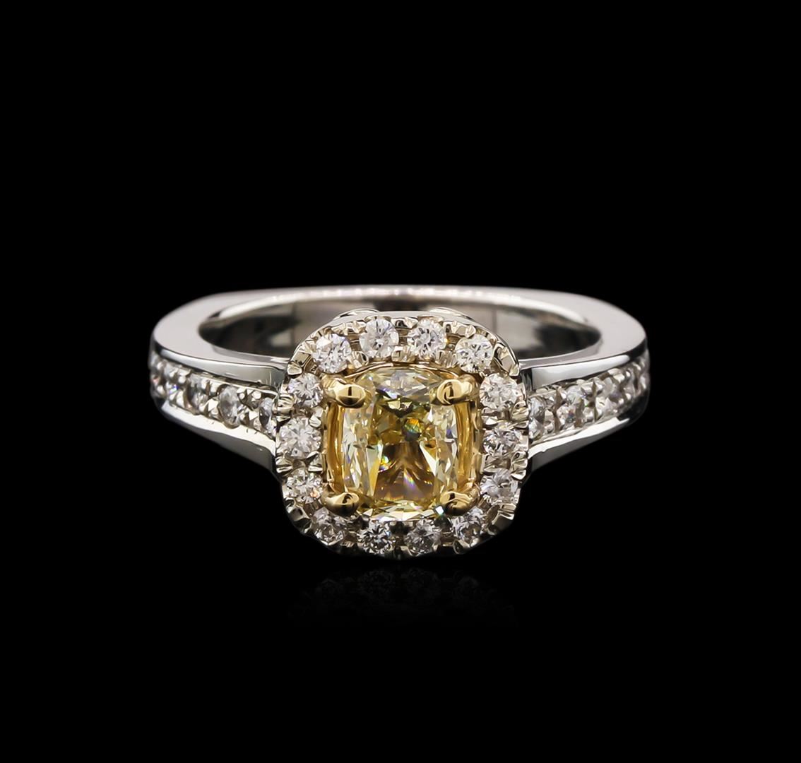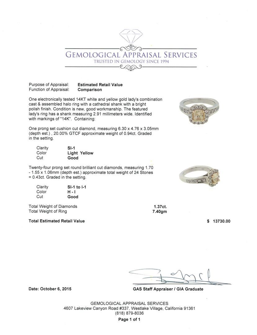 One electronically tested 14KT white and yellow gold lady's combination cast & assembled halo ring with a cathedral shank with a bright polish finish. The featured lady's ring has a shank measuring 2.91 millimeters wide. Identified with markings of "14K". Condition is new, good workmanship. Containing: One prong set cushion cut diamond, measuring 6.30 x 4.76 x 3.05mm (depth est.) , 20.00.%. GTCF approximate weight of 0.94ct. Graded in the setting. Clarity: SI-1 Cut Good Twenty-Four prong set round brilliant cut diamonds, measuring 1.70 - 1.55 x 1.06mm (depth est.) approximate total weight of 24 Stones = 0.43ct. Graded in the setting. Clarity: SI-1 to I-1. Color: H - I. Cut Good. Total Weight of Diamonds 1.37ct. Total Weight of Ring 7.40gm. GAS Appraised at $13,730.00.