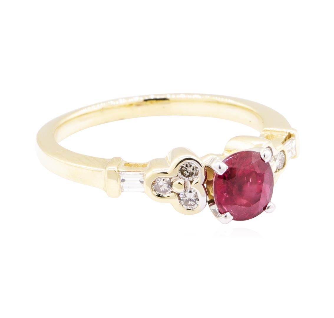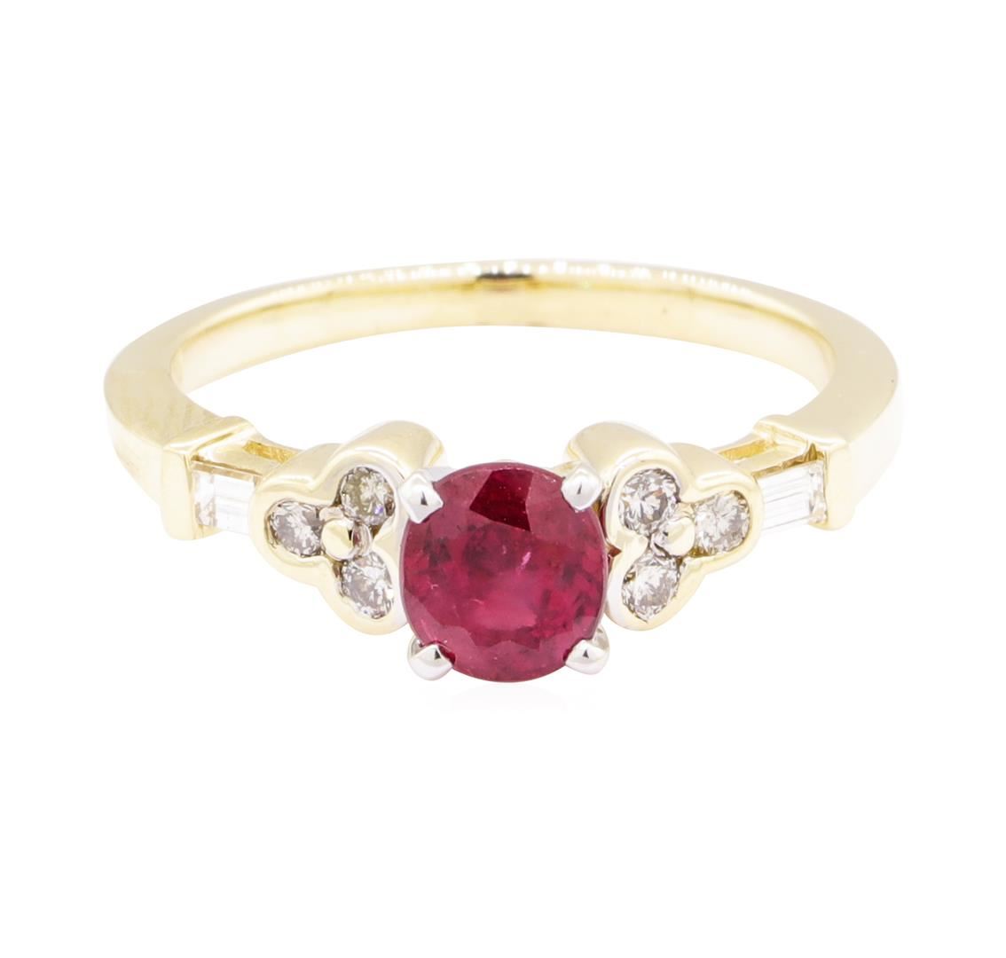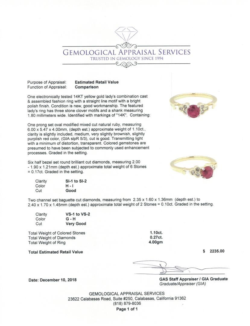 One electronically tested 14KT yellow gold lady's combination cast & assembled fashion ring with a straight line motif with a bright polish finish. The featured lady's ring has three stone clover motifs and a shank measuring 1.80 millimeters wide. Identified with markings of '14K'. Condition is new, good workmanship. Containing: One prong set oval modified mixed cut natural ruby, measuring 6.00 x 5.47 x 4.00mm, (depth est.) approximate weight of 1.10ct., clarity is slightly included, medium, very slightly brownish, slightly purplish red color, (GIA slpR 5/3), cut is good. Transmitting light with a minimum of distortion, transparent. Colored gemstones are presumed to have been subjected to commonly used enhancement processes. Graded in the setting. Six half bezel set round brilliant cut diamonds, measuring 2.00 - 1.90 x 1.21mm (depth est.) approximate total weight of 6 Stones = 0.17ct. Graded in the setting. Color H - I Clarity SI-1 to SI-2 Cut Good Two channel set baguette cut diamonds, measuring from 2.35 x 1.60 x 1.36mm (depth est.) to 2.40 x 1.70 x 1.45mm (depth est.) approximate total weight of 2 Stones = 0.10ct. Graded in the setting. Color G - H Clarity VS-1 to VS-2 Cut Very Good. Total Weight of Colored Stones 1.10ct.. Total Weight of Diamonds 0.27ct.. Total Weight of Ring 4.00gm GAS Appraised at $2235.00. GAS Appraised at $2,235.00.