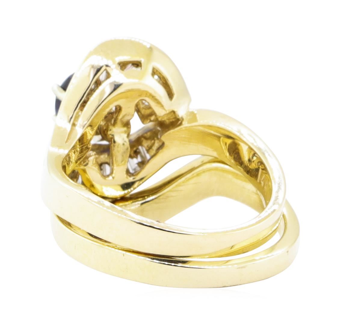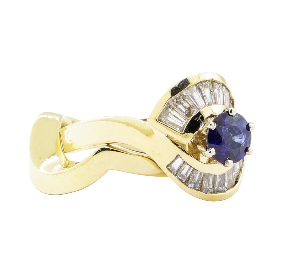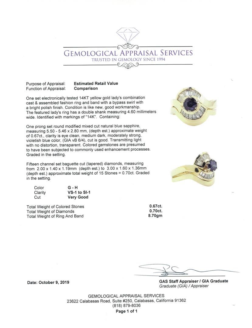 One set electronically tested 14KT yellow gold lady's combination cast & assembled fashion ring and band with a bypass swirl with a bright polish finish. The featured lady's ring has a double shank measuring 4.60 millimeters wide. Identified with markings of '14K'. Condition is Good. Containing: One prong set round modified mixed cut natural blue sapphire, measuring 5.50 - 5.46 x 2.80 mm, (depth est.) approximate weight of 0.67ct., clarity is eye clean, medium dark, moderately strong, violetish blue color, (GIA vB 6/4), cut is good. Transmitting light with no distortion, transparent. Colored gemstones are presumed to have been subjected to commonly used enhancement processes. Graded in the setting. Fifteen channel set baguette cut (tapered) diamonds, measuring from 2.00 x 1.40 x 1.19mm (depth est.) to 3.00 x 1.60 x 1.36mm (depth est.) approximate total weight of 15 Stones = 0.70 ct. Graded in the setting. Color G - H Clarity VS-1 to SI-1 Cut Very Good. Total Weight of Colored Stones 0.67ct.. Total Weight of Diamonds 0.70 ct.. Total Weight of Ring And Band 8.70gm GAS Appraised at $4530.00. GAS Appraised.