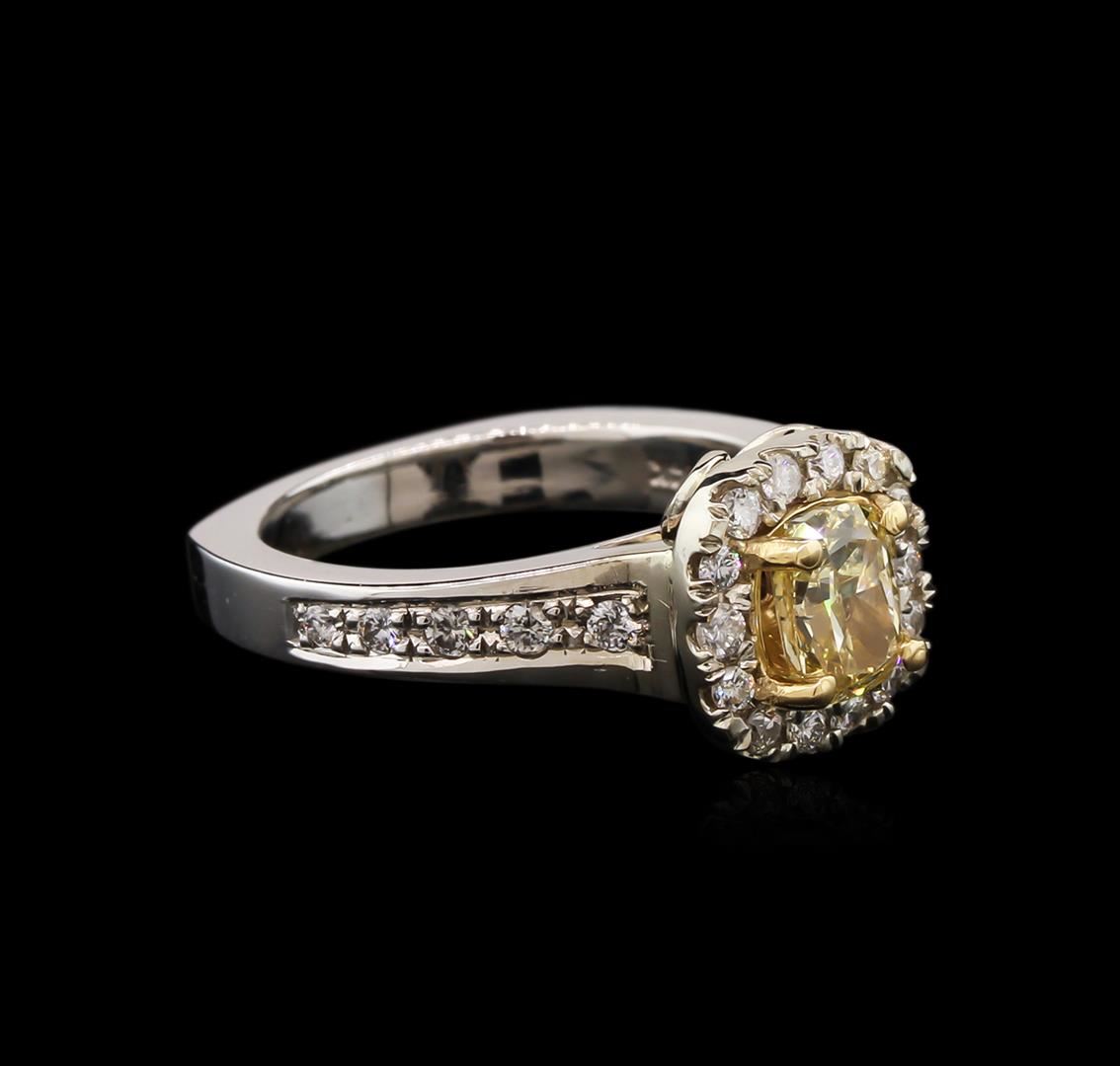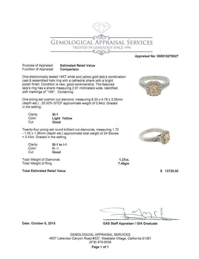 One electronically tested 14KT white and yellow gold lady's combination cast & assembled halo ring with a cathedral shank with a bright polish finish. The featured lady's ring has a shank measuring 2.91 millimeters wide. Identified with markings of "14K". Condition is new, good workmanship. Containing: One prong set cushion cut diamond, measuring 6.30 x 4.76 x 3.05mm (depth est.) , 20.00.%. GTCF approximate weight of 0.94ct. Graded in the setting. Clarity: SI-1 Cut Good Twenty-Four prong set round brilliant cut diamonds, measuring 1.70 - 1.55 x 1.06mm (depth est.) approximate total weight of 24 Stones = 0.43ct. Graded in the setting. Clarity: SI-1 to I-1. Color: H - I. Cut Good. Total Weight of Diamonds 1.37ct. Total Weight of Ring 7.40gm. GAS Appraised at $13,730.00.