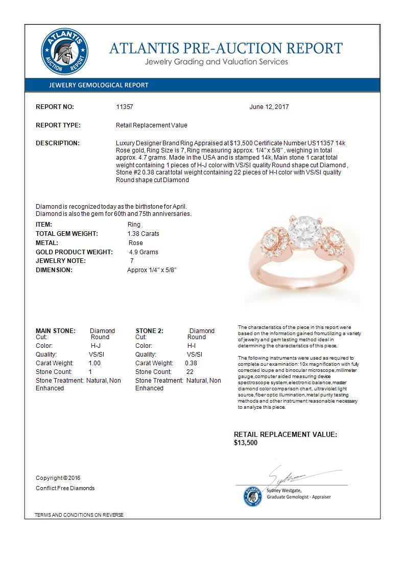 1.38 CTW Certified VS/SI Diamond Ring 14K Rose Gold ---- Luxury Designer Brand Ring Appraised Retail Price at $13,500 ---- SKU Number US11357 14k Rose gold Ring Size is 7, Ring measuring approx. 1/4" x 5/8" , weighing in total approx. 4.7 grams. Made in the USA and is stamped 14k, Main stone 1.00 carat total weight containing 1 pieces of H-J color with VS/SI quality Round shape cut Diamond , Stone #2 0.38 carat total weight containing 22 pieces of H-I color with VS/SI quality Round shape cut