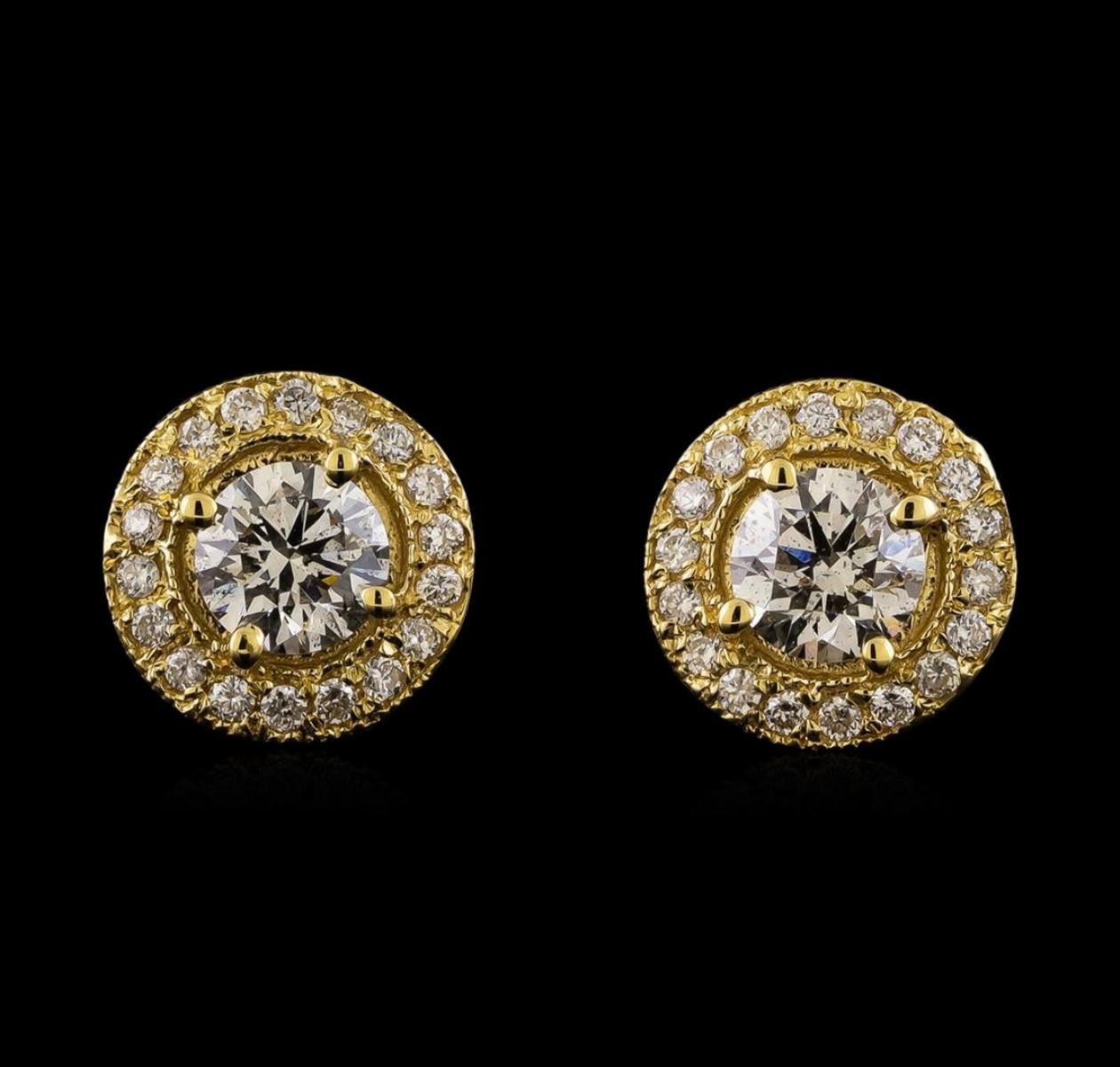 One pair electronically tested 14KT yellow gold lady's combination cast & assembled stud earrings with friction posts with a halo with a bright polish with milgrain detailing finish. Identified with markings of 'K14'. Condition is new, good workmanship. Containing: Two prong set round brilliant cut diamonds, measuring 5.06 - 5.03 x 3.18mm (depth est.) , 10.00.%. GTCF approximate total weight of 2 Stones = 1.10 ct. Graded in the setting. Clarity SI-2. Color: H - I Cut Good Thirty-Six prong set round brilliant cut diamonds, measuring 1.30 - 1.25 x 0.79mm (depth est.) approximate total weight of 36 Stones = 0.28ct. Graded in the setting. Clarity SI-1 to SI-2. Color: G - H Cut Good. Total Weight of Diamonds 1.38ct.. Total Weight of Earrings 3.20gm. GAS Appraised.