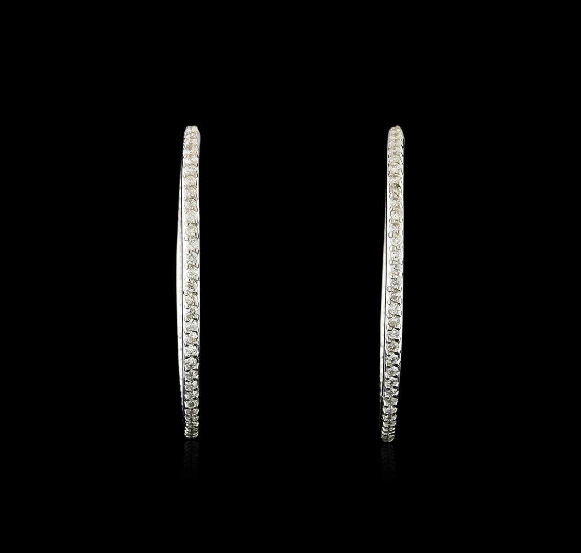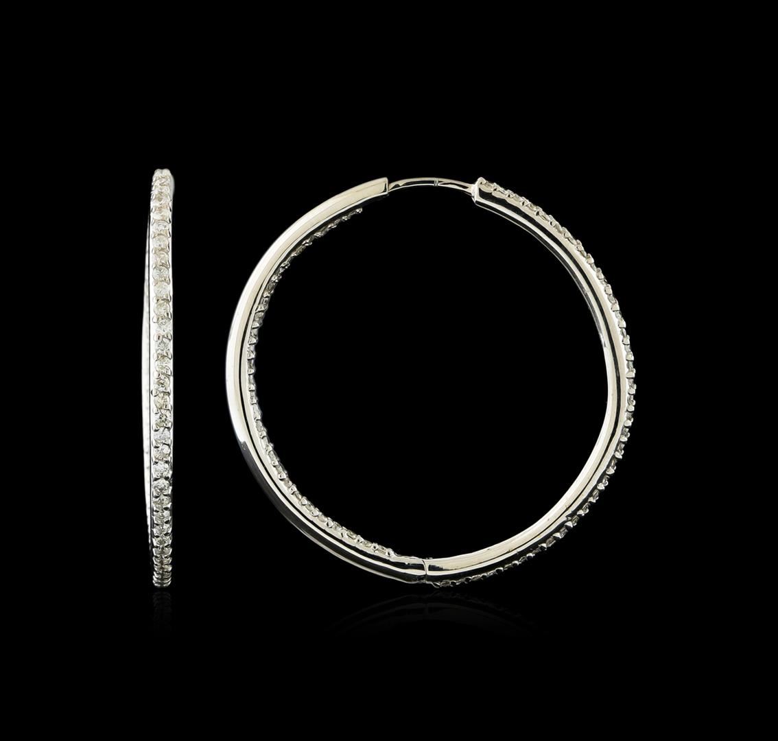 One pair electronically tested 14KT white gold ladies cast & assembled diamond hoop earrings with hinged, snap locking posts. Each earring features a two millimeter wide diamond ribbon set within a one and one-half inch diameter hoop. Bright polish finish. Condition is new, good workmanship. Containing: One Hundred Twenty-Four prong set round brilliant cut diamonds, measuring 1.50 - 1.40 x 0.87mm (depth est.) approximate total weight of 124 Stones = 1.38ct. Graded in the setting. Clarity: SI-2 to I-2. Color: F - H. Total Weight of Diamonds 1.38ct. Total Weight of Earrings 10.45gm. AIG Appraised at $5,935.00.