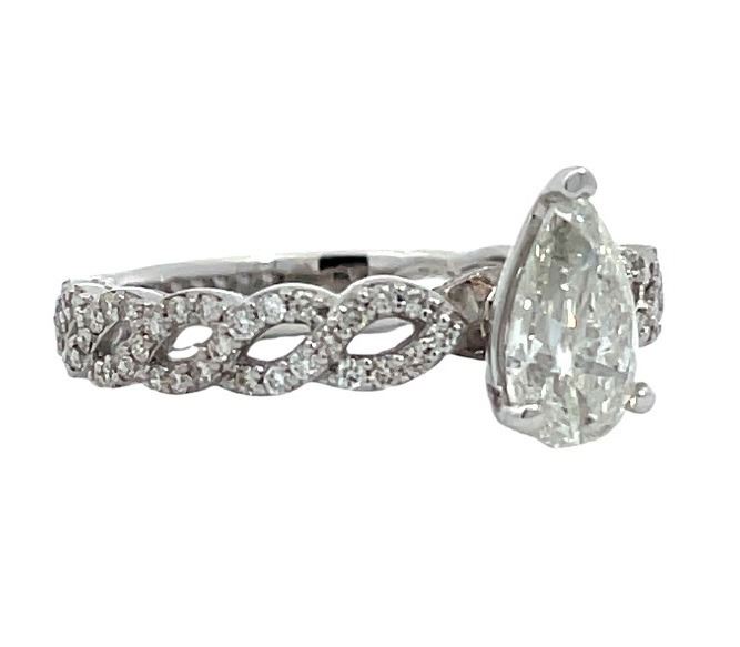 One electronically tested 14KT white gold lady's combination cast & assembled fashion twist motif wedding ring with a twist down the straightline shank with a bright polish with milgrain detailing finish. The featured lady's ring has a shank measuring 3.30 millimeters wide. Identified with markings of "14K". Condition is new, good workmanship. Containing: One prong set pear shaped cut diamond, measuring 9.00 x 5.35 x 3.37mm (depth est.) , 7.00% GTCF approximate weight of 1.00ct. Graded in the setting. Color H - I Clarity I-1 Cut Very Good Eighty prong set round brilliant cut diamonds, measuring 1.10 - 1.05 x 0.67mm (depth est.) approximate total weight of 80 Stones = 0.38ct. Graded in the setting. Color H - I Clarity VS-2 to SI-2 Cut Very Good Total Weight of Diamonds 1.38ct. Total Weight of Wedding Ring 3.70gm